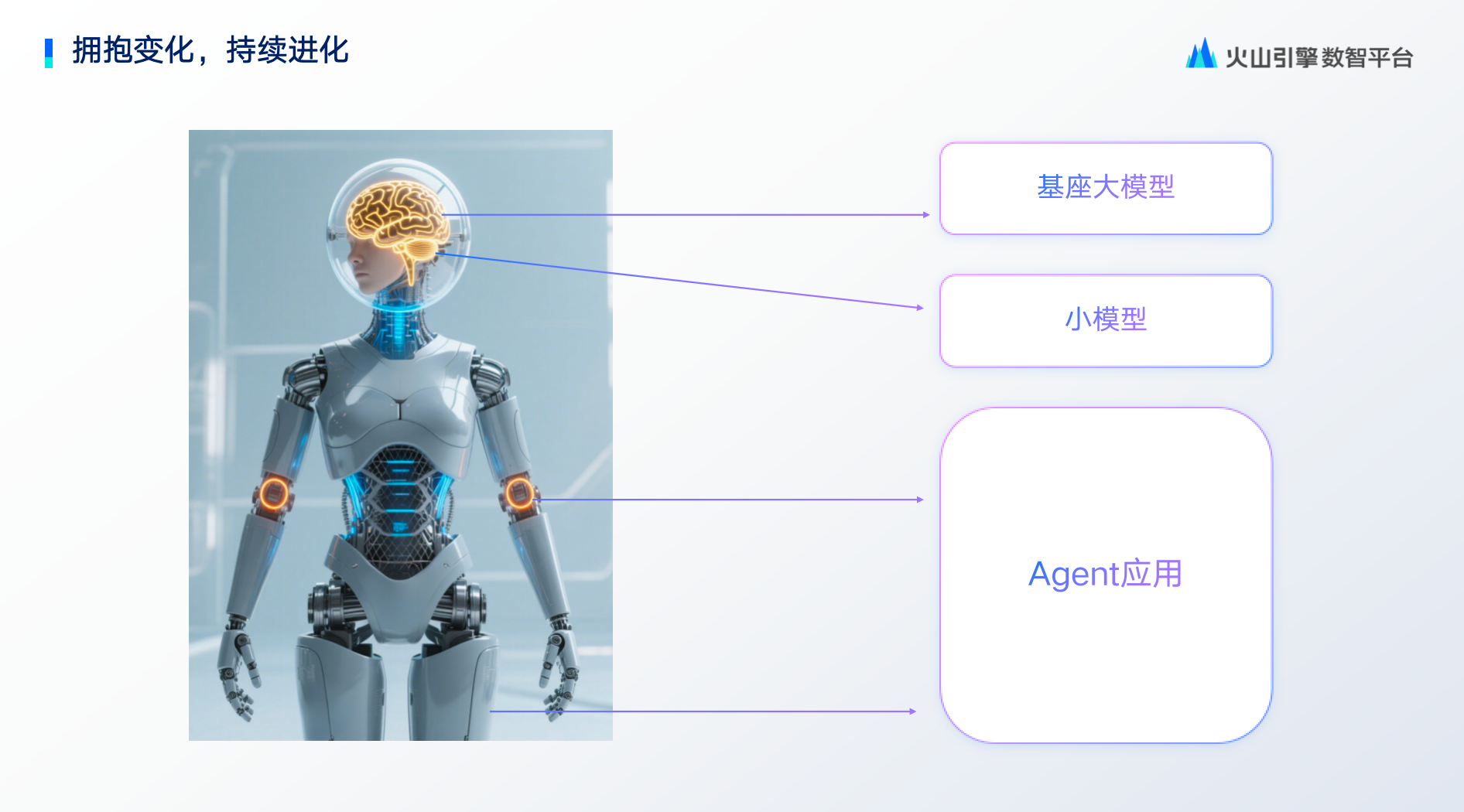 另外,如何避免目前所做的工作被大模型的快速迭代推翻呢?关键在于架构设计上的解耦。整体架构包含三部分:大模型(类比人的大脑,直接采用如豆包或 DeepSeek)、小模型(类比人的小脑,作为手和脚的精准调控中心,细分领域精准能力的补充)、以及工程应用(类比手和脚),这种架构能够保障三者各司其职但又紧密结合、能力互补,同时,随着大模型迭代升级,我们的 Agent 能力也会随之进化。大家都知道,现在大模型差不多每三个月就有一次重大更新,新版本发布后,我们能快速切换到最新模型,只需对上层应用稍作适配,就能进一步提升 Agent 的效果和效率。