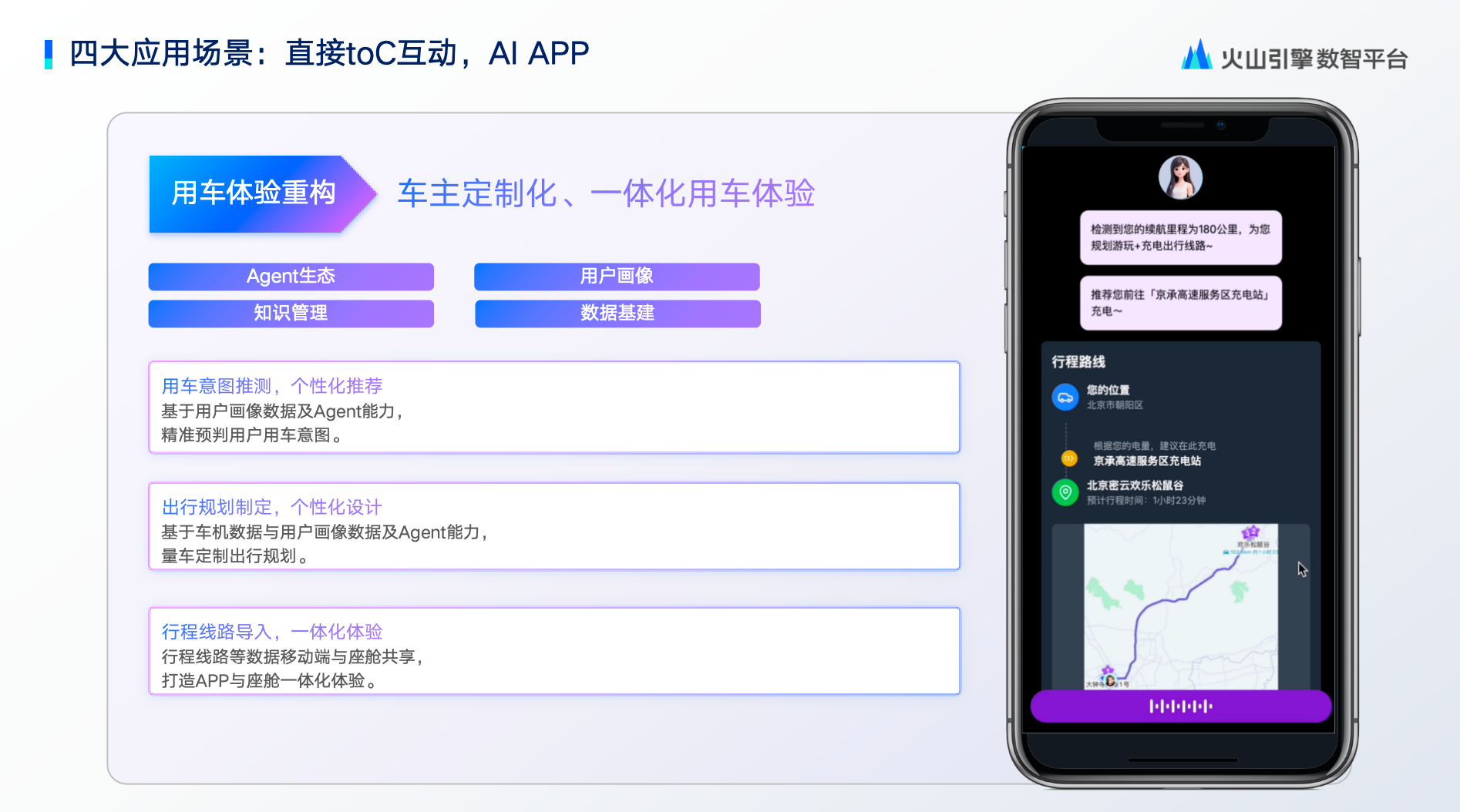 第三个是直接 To C 交互场景。以汽车行业为例,可以在车载屏或车主 APP 嵌入智能助手,比如输入“周末带娃去周边游”,它能基于用户历史偏好、家庭成员情况、位置、车型和续航,智能规划路线、查找充电站和美食,制定完整出游方案。实际上,任何拥有客户端或小程序的客户,都可以根据业务需求尝试这类 APP 功能升级。