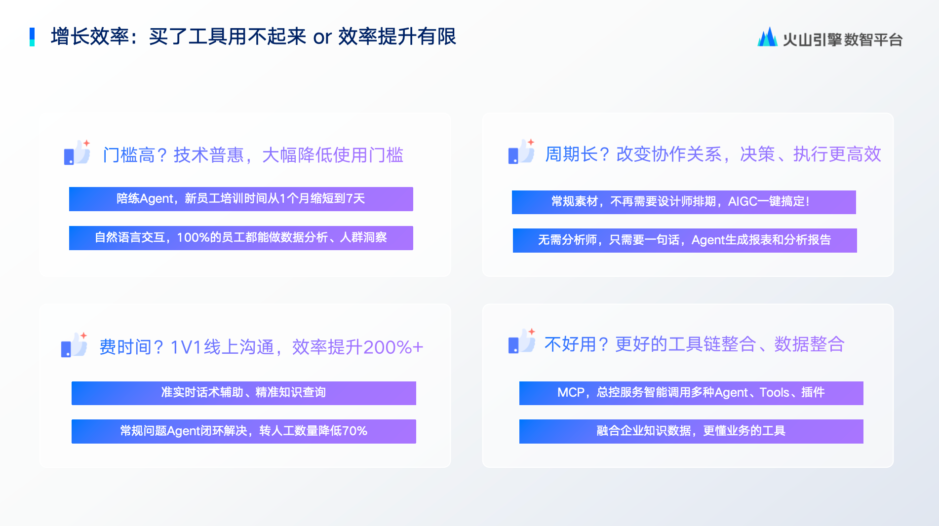 效率是我们日常工作的基石。阻碍效率提升的因素,首先是用起来的门槛高,过去大家可能都经历过,投入不少资源做平台系统建设,结果用起来的人却不多。大模型的典型优势在于技术普惠,它通过拟人化的自然语言交互,解决了很多过去使用门槛高的问题,比如一句话就能生成分析报表或给出答案、查询业务知识;再比如,我们有个客户用了智能营销 Agent 后,新员工从入职到上手的时间,从过去需要一个月培训,大幅缩短到仅需 7 天,而且能达到金牌或银牌客服的水平。
