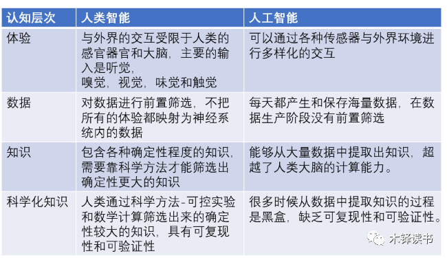 既然我们通过名词定义已经建构了一个认知的金字塔结构,我们就拾级而上从塔底到塔顶分别分析一下人类智能与人工智能的异同。