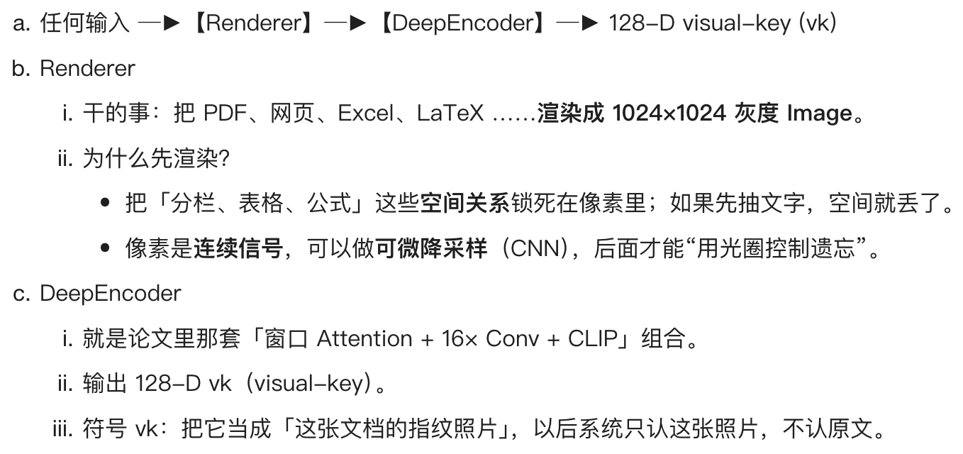 把 DeepEncoder 当成一枚「光学视网膜」,与语义向量并行工作:
