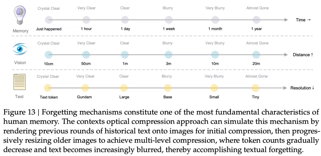 计算机体系结构中的“内存分层” (Memory Hierarchy): 我们可以将 LLM 的注意力上下文视为 CPU 的 L1/L2 Cache,高速但昂贵。而通过光学压缩存储的上下文,就像是主存(DRAM)甚至硬盘(SSD)。它容量大、成本低,但访问(解码)时需要一次“解压缩”操作。下图中的模拟“记忆遗忘”机制,更是将这个比喻推向了极致。