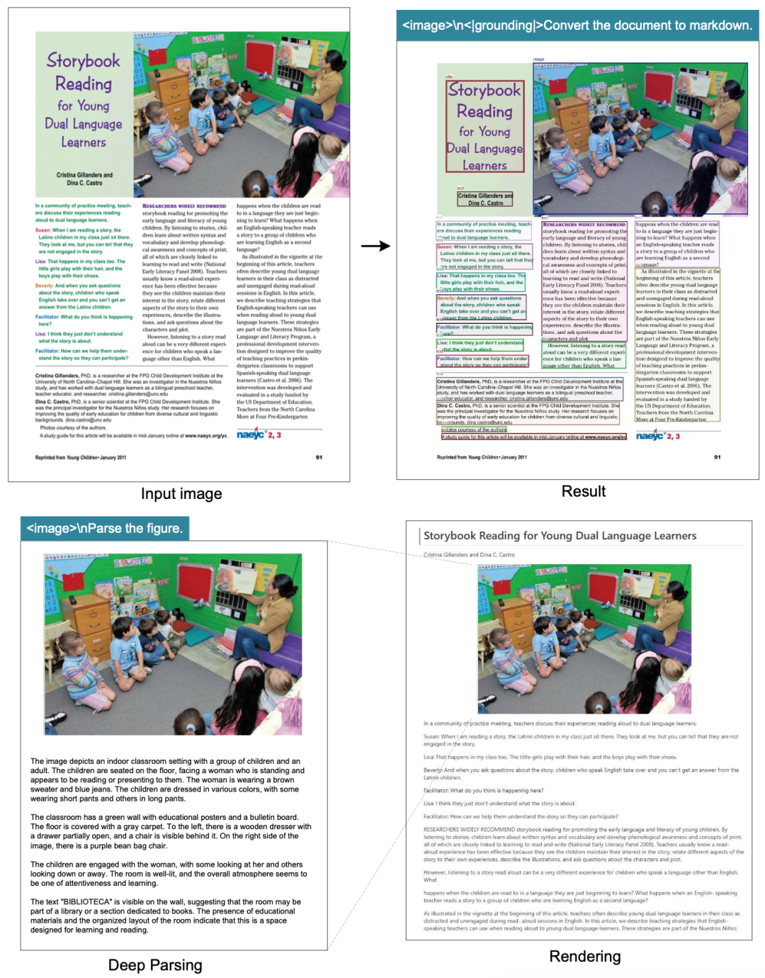 数据工程的支撑:注意到大模型已经隐式地学习了这种隐射关系。因为其训练数据不仅包括传统的 OCR 1.0 数据(多语言、粗/细粒度文档标注),还包括复杂的 OCR 2.0 数据(图表解析、化学公式、平面几何)。这确保了模型学到的视觉 Token 不只是像素的表示,而是高层次的、结构化的语义信息。