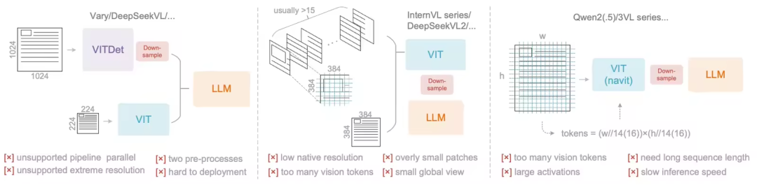 解码的方案有千千万,比如:InternVL 的瓦片方法或 Qwen-VL 的自适应分辨率编码。但是它们的问题在于,传统 VLM 编码器在高分辨率下要么产生过多 Token,要么导致激活内存爆炸,影响训练和推理效率。