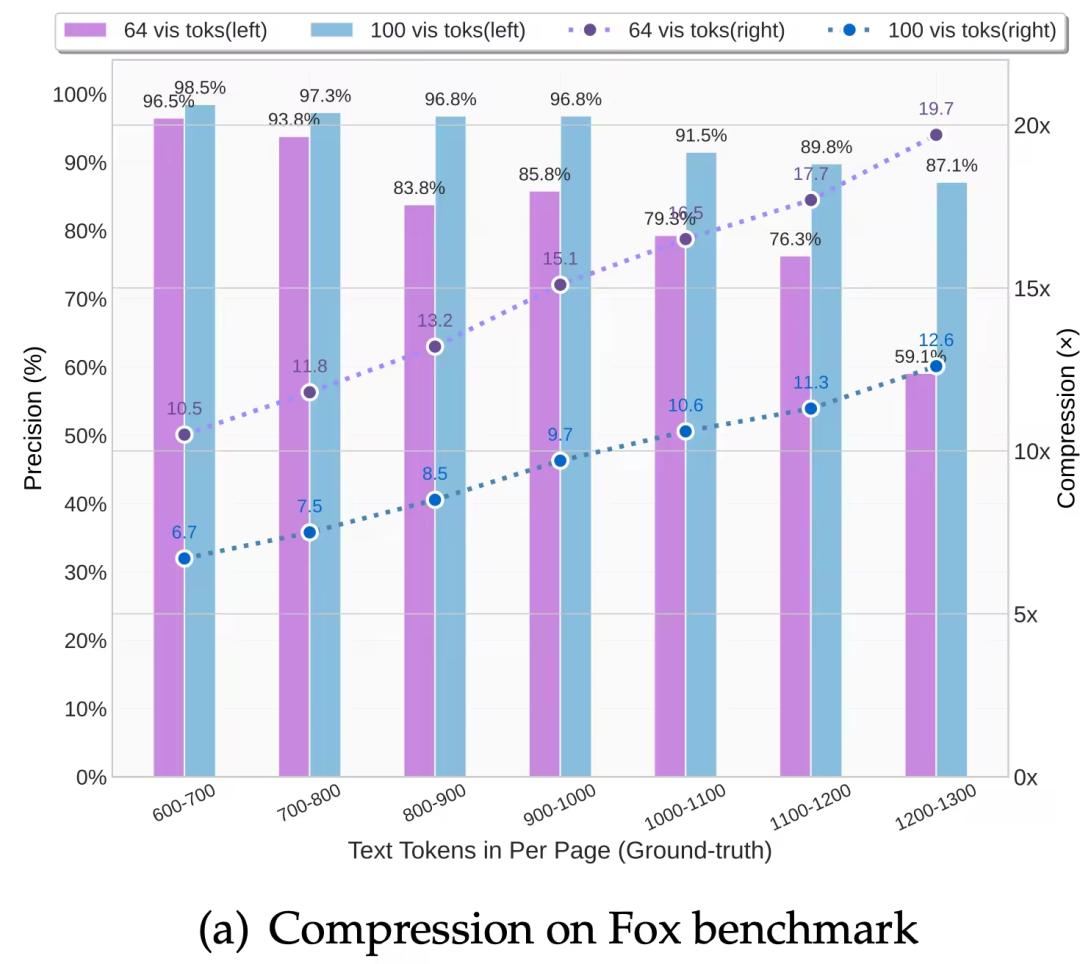 当文本 Token 数量是视觉 Token 的 10 倍以内(压缩比 < 10x)时,模型可以达到约 97% 的 OCR 解码精度。