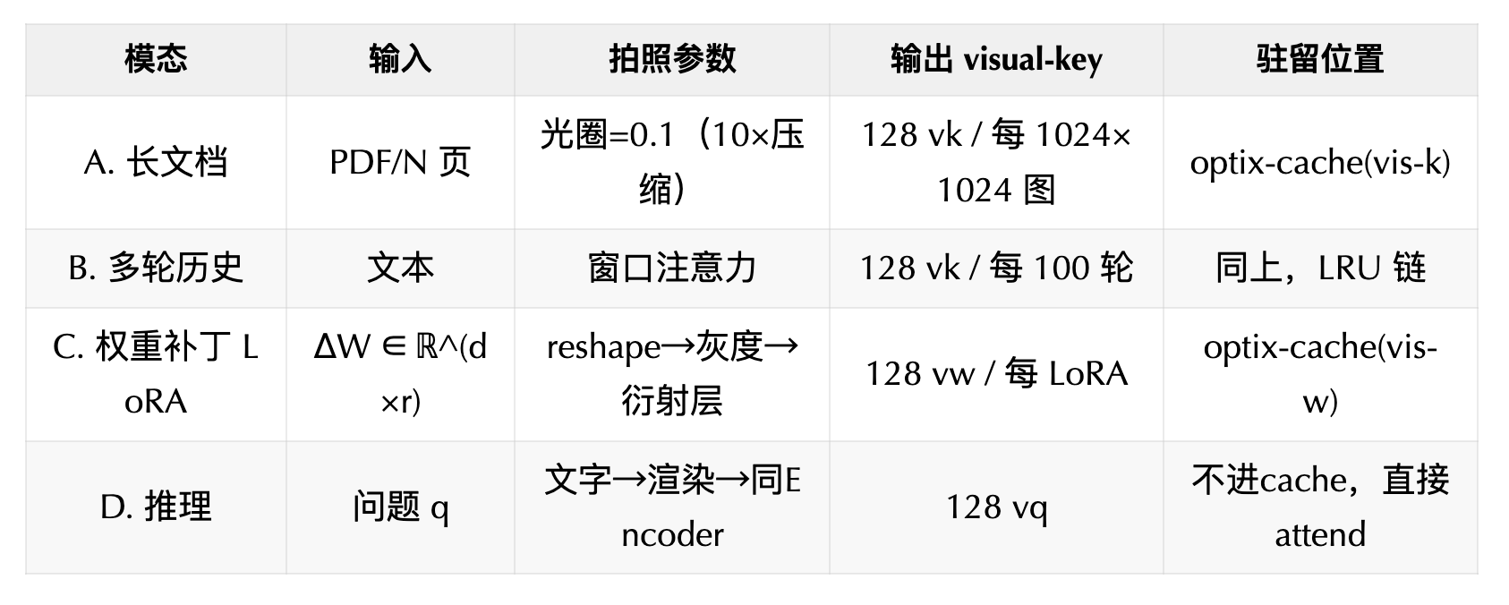 「任何长度的文本、权重、对话,一律先拍成一张 1024×1024 灰度图,再压成 128 个 vision-token,成为唯一寻址单位;Attention 永远只在这 128×128 的“光斑”里做二次运算。」