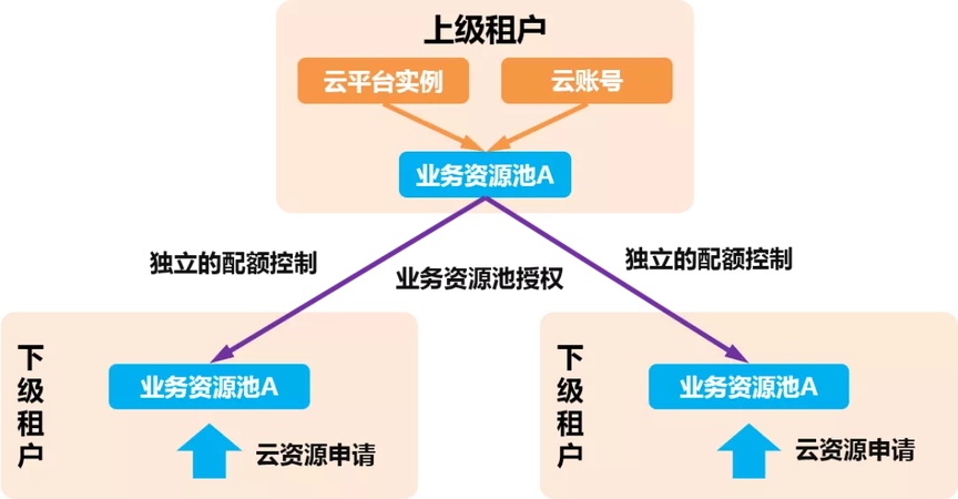 2) 上级租户可以将云平台的已接入能力授权给下级租户进行使用,包括已纳管的云资源或是云账号的使用权限;