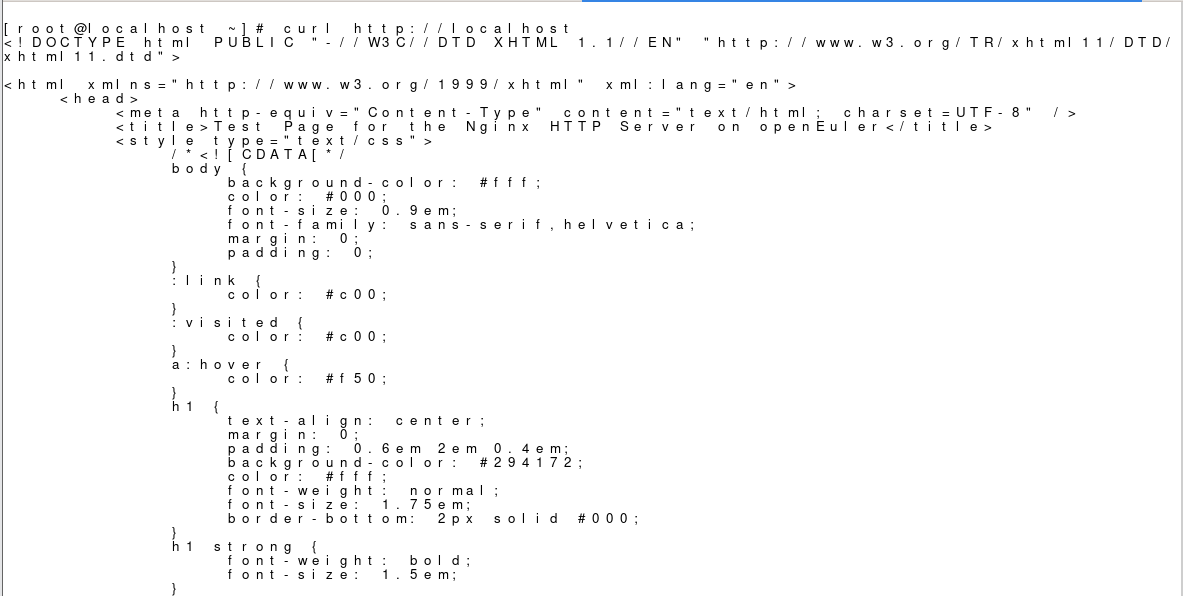 通过curl本地测试,成功返回 Nginx 的默认欢迎页面 HTML 代码,证明 Web 服务器已正常运行。