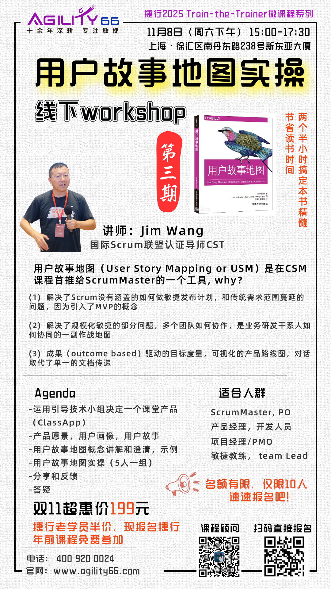捷行常年独家提供线上线下CSM/A-CSM/CSP-SM/CSPO/A-CSPO/CAL/LeSS/SAFe等中英文授课的认证培训;并提供业务敏捷和敏捷领导力,企业文化重塑,Scrum敏捷软硬件开发,敏捷产品创新,敏捷项目管理等内训和工作坊辅导。