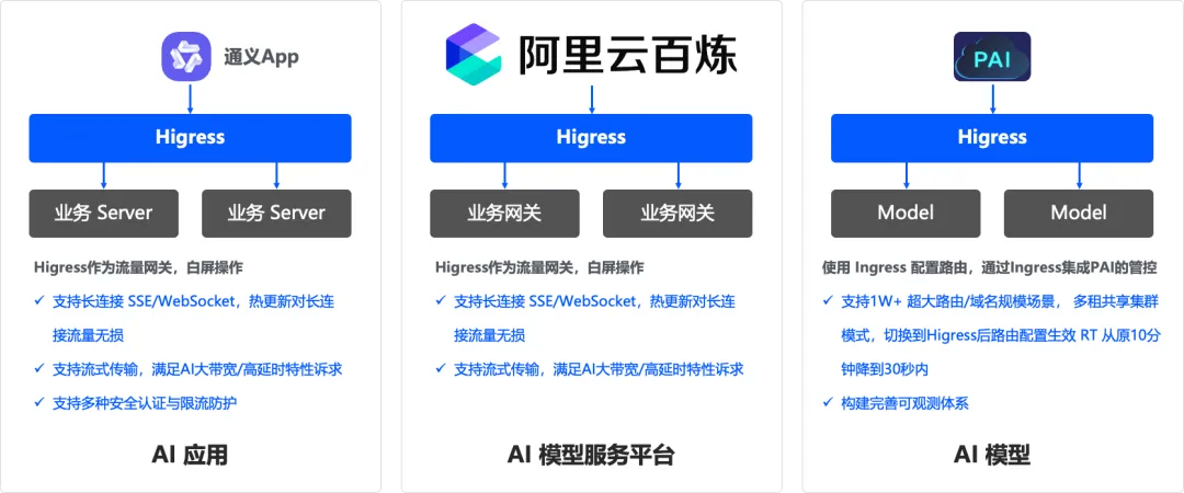 在推出商业版的 AI 网关之前,Higress 在阿里云内部进行了大量的探索,当前已成为阿里云 AI 流量的核心承载网关,包括通义 APP、阿里云百炼、PAI 等服务,背后都有 Higress 的身影。