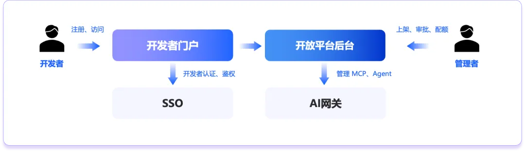 AI 开放平台后台:这一层面向管理员,管理三大核心对象:门户(portal)、产品(product,包括 MCP Server 和 Agent)、开发者。