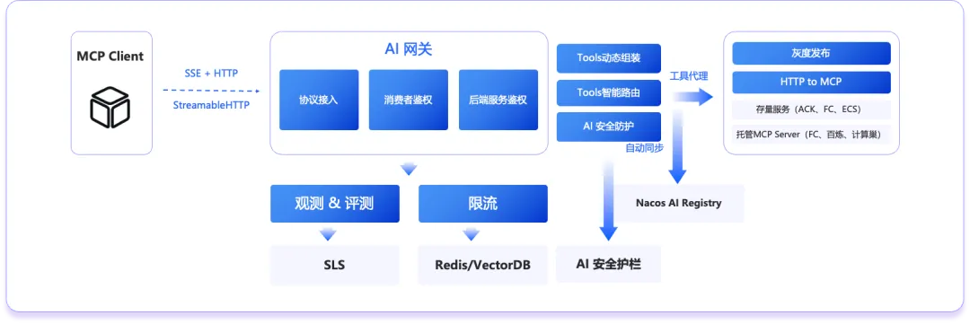 安全:与模型访问类似,AI 网关在工具访问场景同样建设了丰富的安全能力,针对调用方的消费者鉴权,除支持 MCP Server 粒度的鉴权配置外,还可以针对某个工具单独设置鉴权,从而实现为不同风险等级的 Tool 赋予不同调用方权限的目的;针对 MCP 描述、工具描述、工具响应结果中的注入问题,可对接 AI 安全防护,在调用源头进行防护。