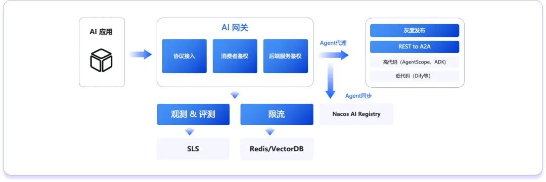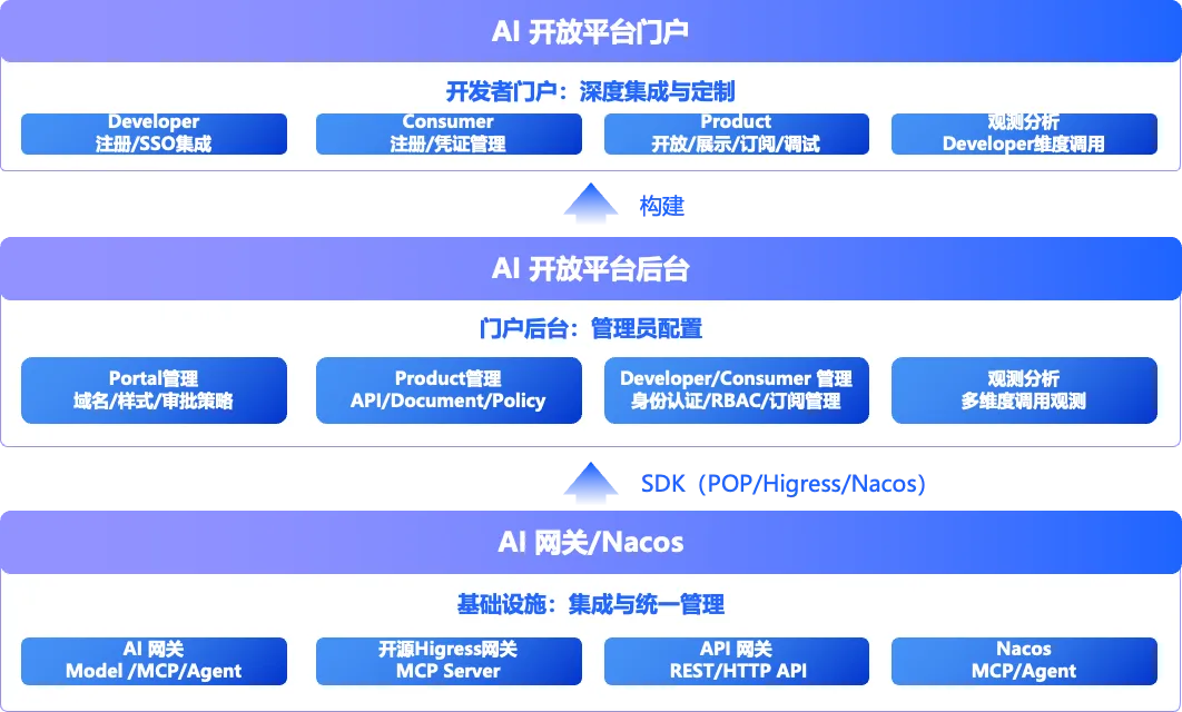AI 网关/Nacos:这一层为基础设施,通常只有管理员可见,并通过 AI 开放平台后台进行统一管理与集成。