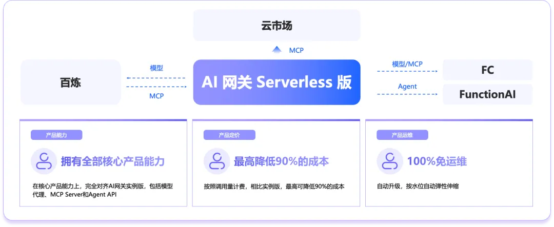 AI 网关在云栖前上线了 Serverless 版,相比专享实例版,Serverless 版极大地降低了开通和使用成本,在阿里云 Serverless AI 场景的大图上补上了重要的一块。AI 网关结合百炼、FC/FunctionAI 和云市场,用户可构建完整的 Serverless AI 基础设施。。