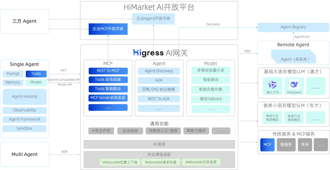 受限于当时 AI 应用的发展水平,最初的商业版 AI 网关只提供了模型代理的能力,但在过去半年中,AI 应用快速发展,MCP、A2A 等协议也逐渐成为主流,AI 网关也从模型代理发展到包含模型、MCP、Agent 三大 API 形态,集成各种治理能力的 AI 应用的统一入口。同时在 AI 网关之上以开源形式独立发展出了 HiMarket AI 开放平台。