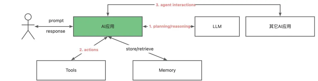 相对于传统应用,AI 应用具有明显的架构特征,简单来说即以模型为中心,通过模型的推理能力,给定提示词,借助工具和记忆,来满足特定的业务诉求。