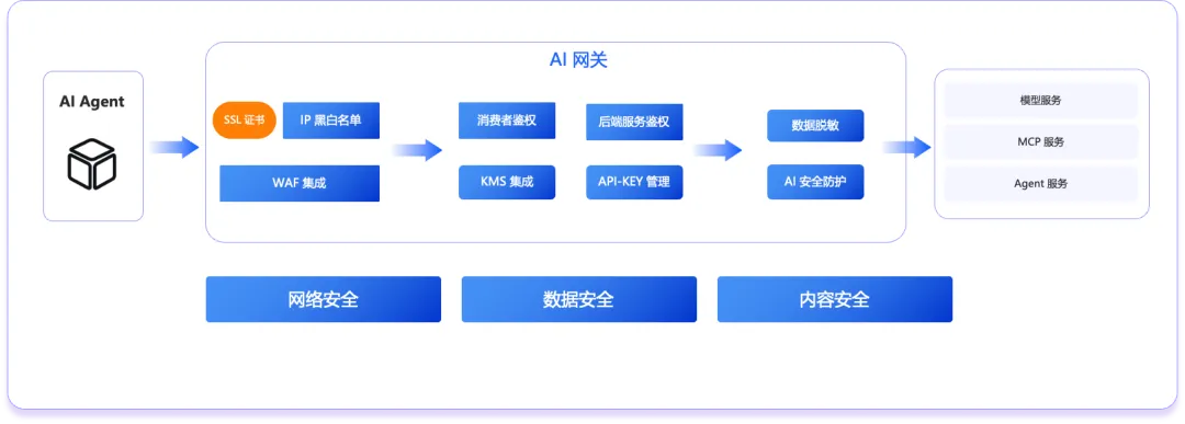 针对 AI 原生架构的安全挑战,AI 网关从网络安全、数据安全和内容安全三个层面进行了安全防护。