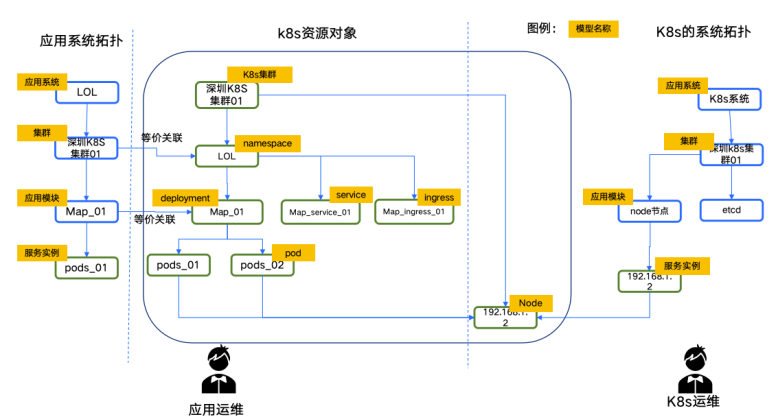 以上两点的本质其实是将 k8s 的资源对象映射为我们日常管理应用的概念(服务树、或者叫做应用拓扑)。所以上面图例中虚线左侧的两个部分(应用系统拓扑、k8s 资源对象)的核心是,通过规范的命名和管理方式使用 k8s 集群,将 k8s 资源数据管理在 CMDB 中形成应用和资源两个视角的数据。