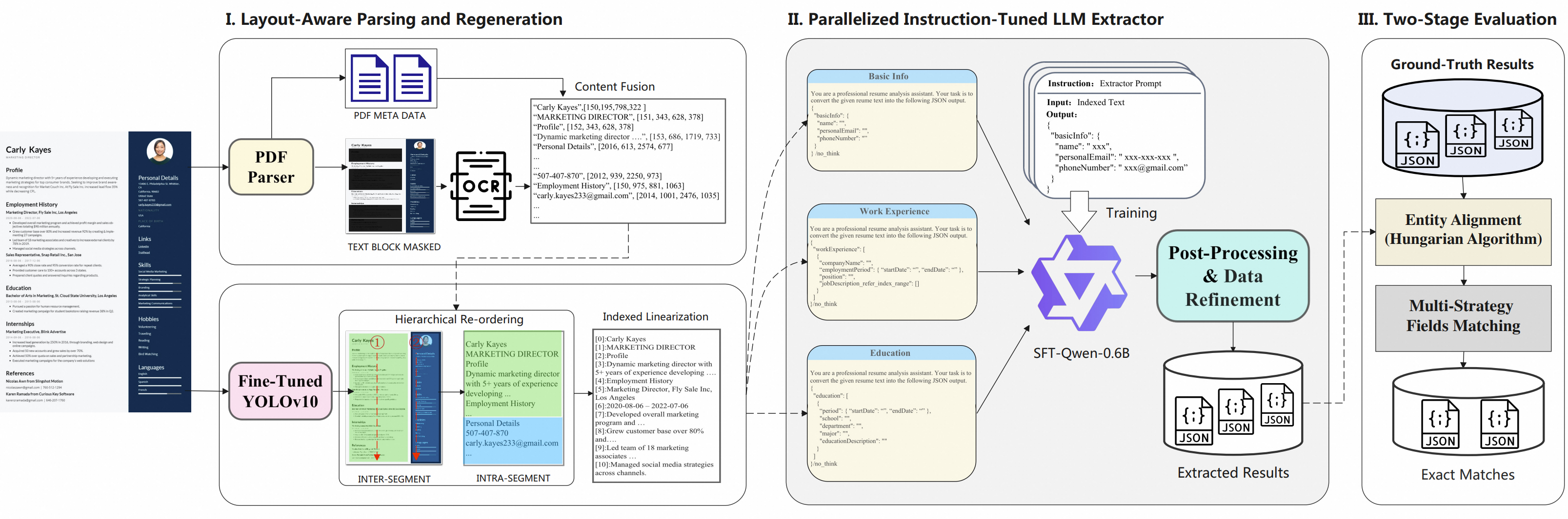 版面检测 (Layout-aware parsing): 通过计算机视觉技术识别简历的布局结构,区分不同信息区域(如个人信息、教育背景、工作经历等)。