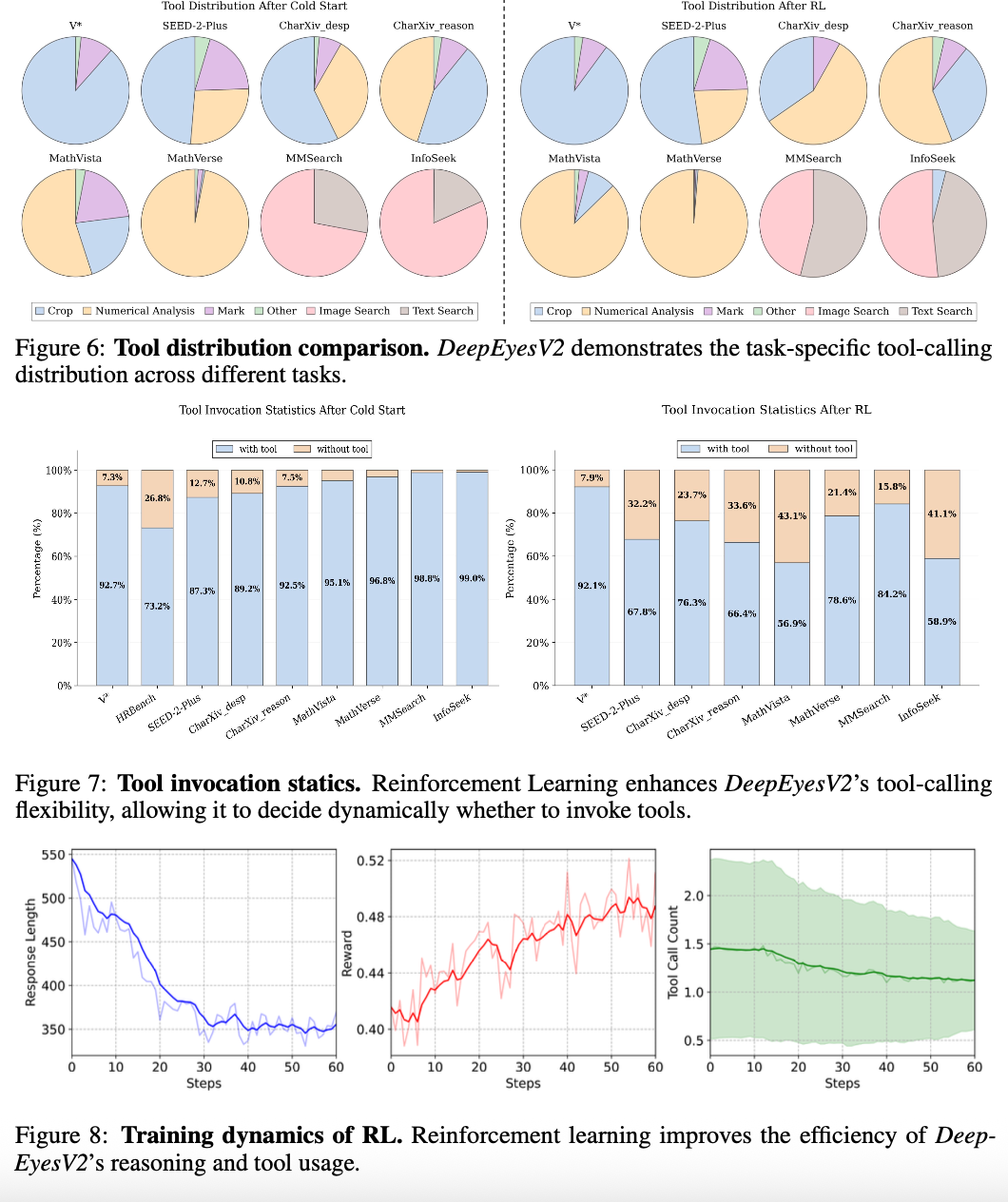 DeepEyesV2 采用两阶段训练法构建其智能体能力。模型在基座模型 Qwen2.5-VL-7B 的基础上,通过强化学习(Reinforcement Learning)进一步增强了鲁棒的工具使用行为,克服了直接强化学习在诱导工具使用行为方面的局限性。其核心机制是将程序代码执行和网络检索视为推理轨迹中可交错的工具,使模型能够在处理图像输入和用户查询时,根据需要生成推理计划并动态调用这些工具。这种统一代码执行和网络搜索的策略,使得模型能够进行可靠且复杂的推理,从而在真实世界理解、数学推理和搜索密集型任务中表现出色。