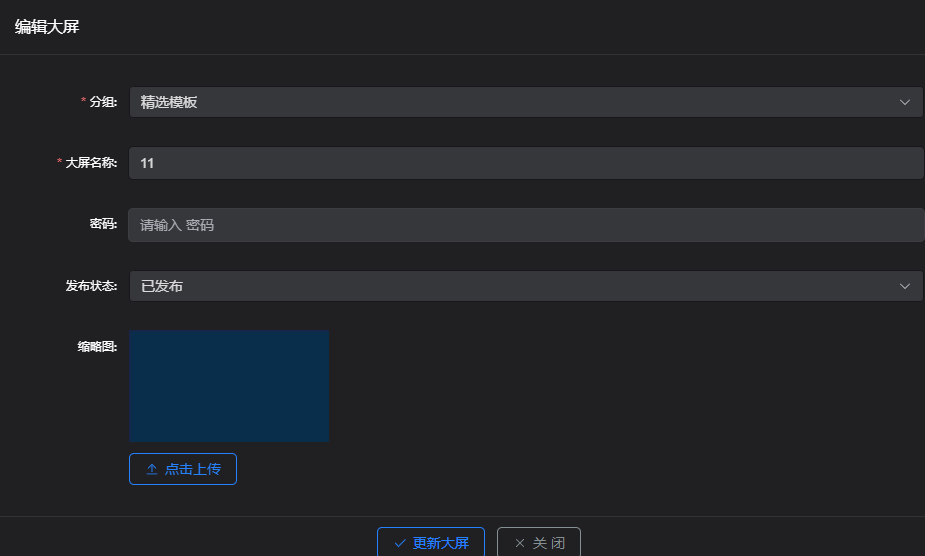 展示编辑大屏信息页面,修改信息后,点击更新大屏,大屏信息修改成功