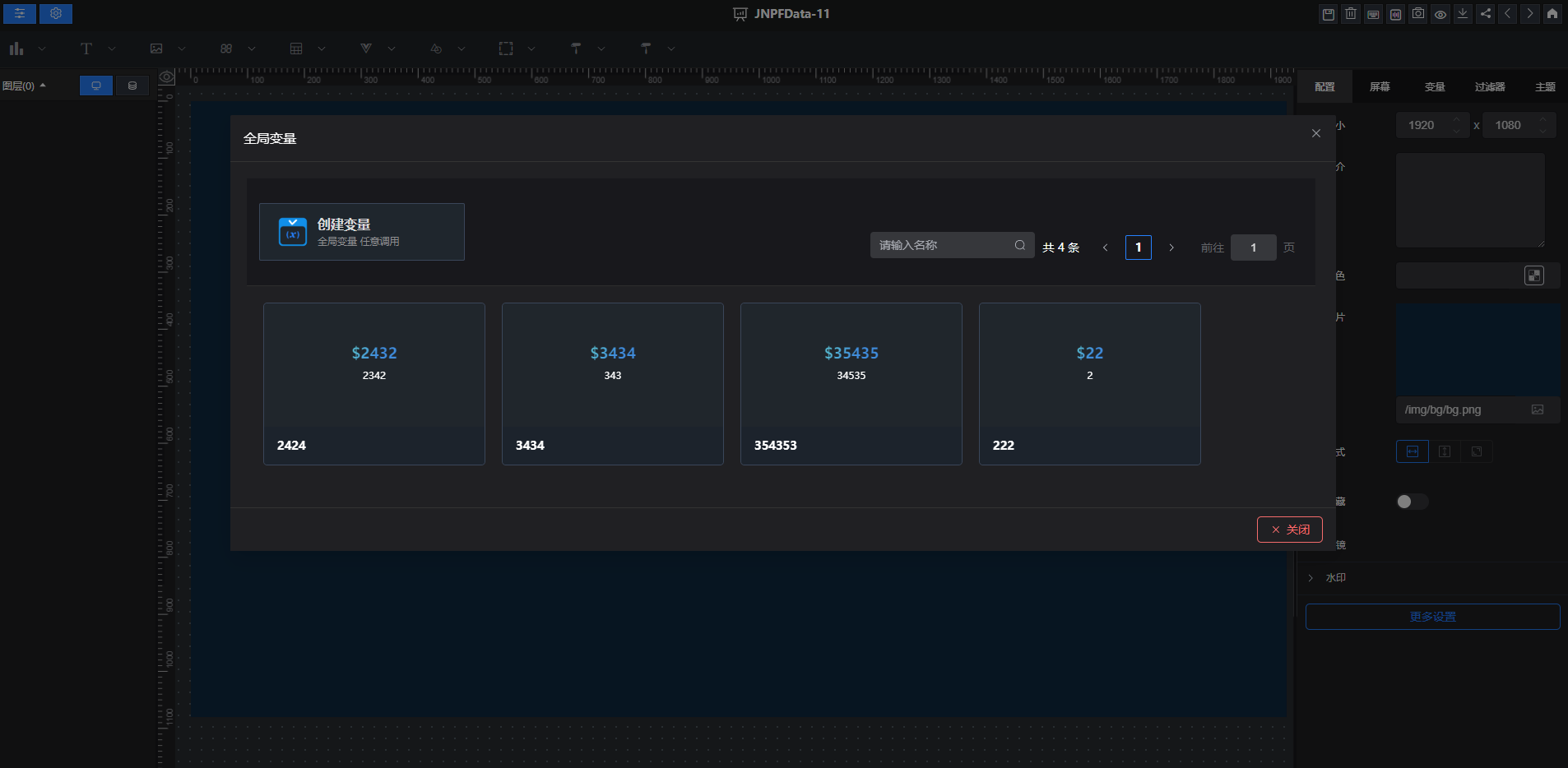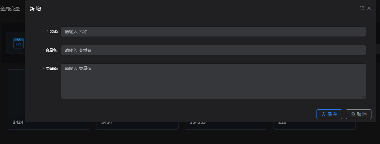 也可在大屏设计中,新建全局变量点击创建变量,展示变量新增数据框,名称、变量名、变量值为必填项,点击保存,变量新建成功,点击取消,取消变量的新建