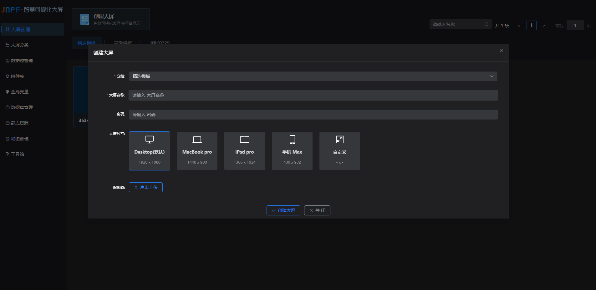 点击新建大屏,展示信息填写内容页面,分组、大屏名称为必填项,大屏尺寸默认为 desktop,可上传缩略图