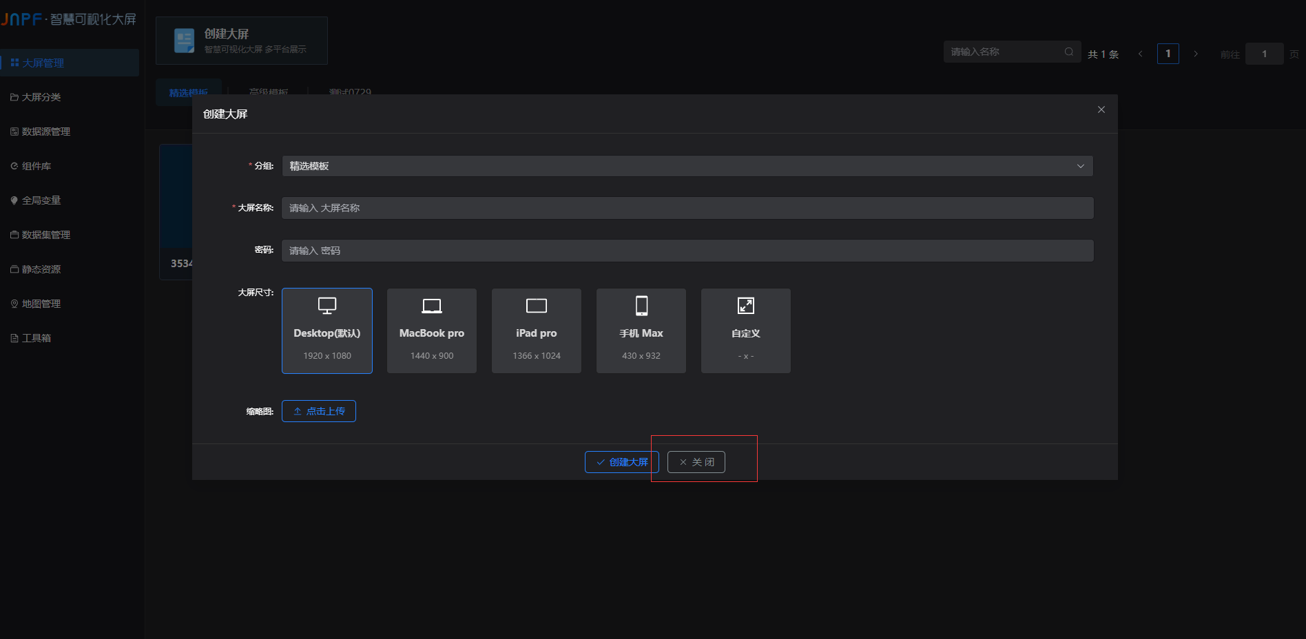 点击关闭按钮,取消大屏的创建,页面回到大屏管理