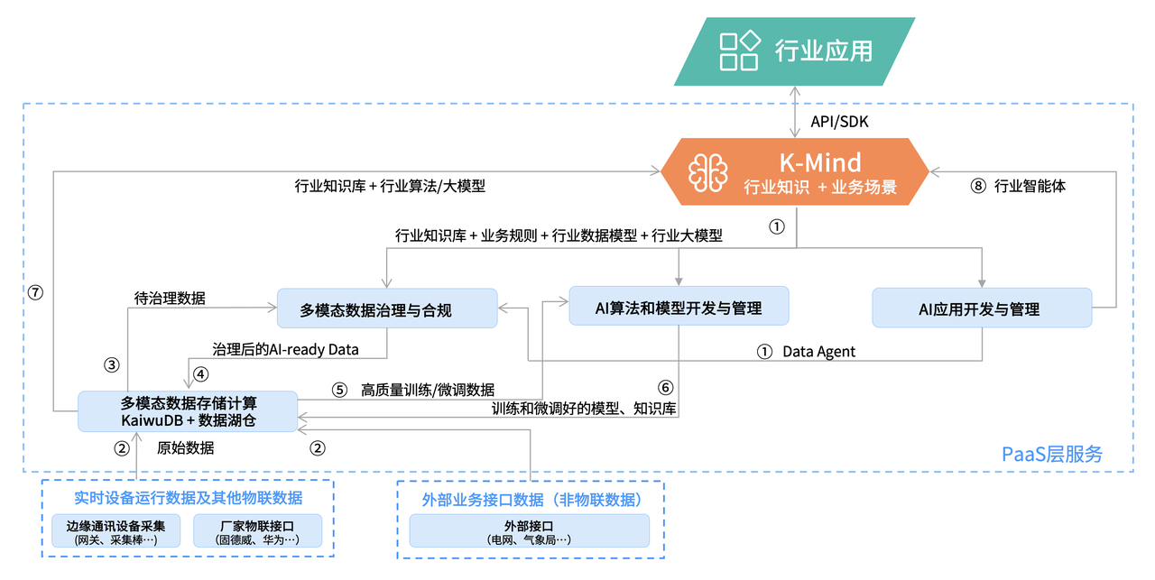从技术架构来看,K-Mind 采用分层设计,底层依托 KaiwuDB 分布式多模数据库与数据湖仓,实现多模态数据的高效存储与计算;中间层通过多模态数据治理与合规、语义层构建,将原始数据转化为 AI-ready 数据,为模型训练提供高质量数据支撑;上层则基于行业知识库、行业算法和模型库,构建行业智能体,通过 API/SDK 为应用层提供服务。