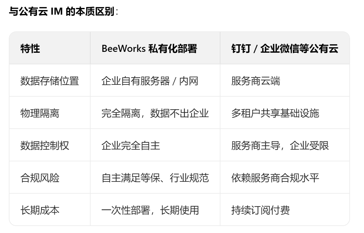 BeeWorks 为代表的私有化部署企业通讯方案,提供了一条不同于公有云 SaaS 模式的道路。这条道路更强调控制权而非便利性,更注重安全而非功能丰富度,更关注长期自主可控而非短期成本节省。