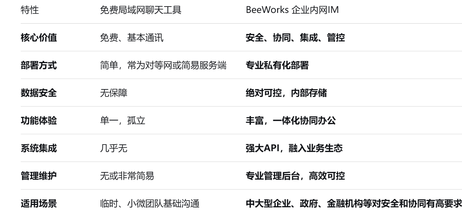 如果您需要一个在实验室、小型团队内部进行临时性、非正式沟通的工具,且对安全、集成、管理没有要求,那么一款简单的局域网聊天工具或许可以一试。但如果您正在为企业寻找一款安全、可靠、高效的正式沟通协作平台,希望它成为企业数字化转型的核心基础设施,那么 BeeWorks 这类提供私有化部署的企业级 IM 解决方案才是真正专业和明智的选择。它提供的远不止“聊天”,而是一整套赋能业务、保障安全、提升效率的现代化协同办公生态系统。