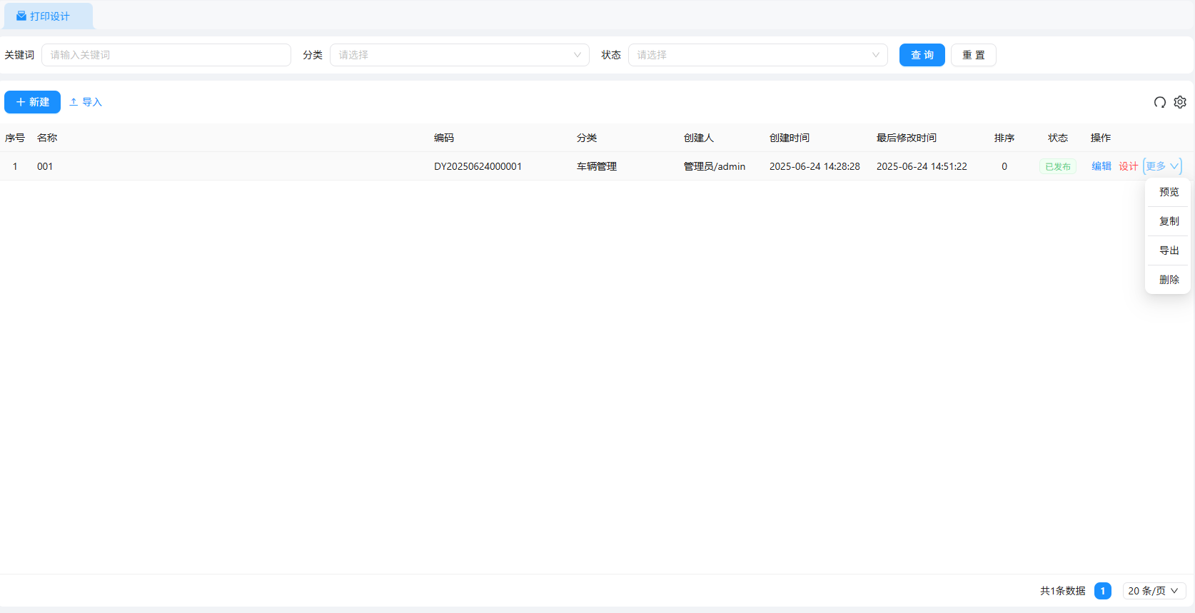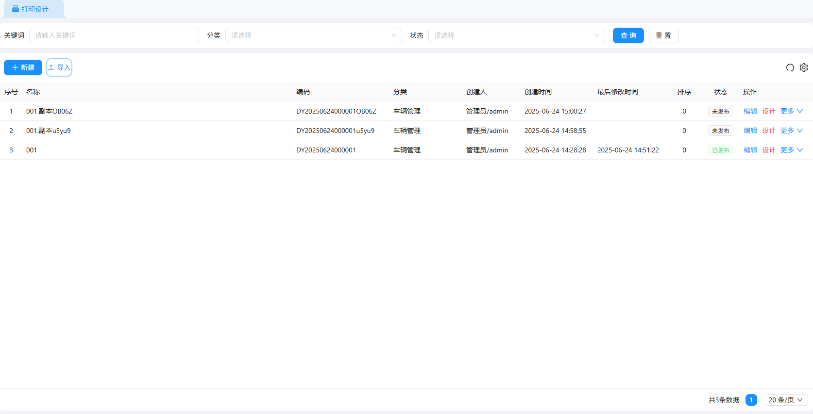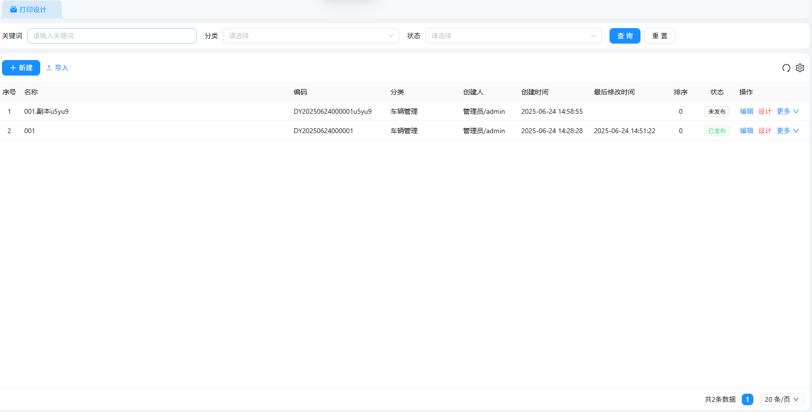 打印设计列表,支持查询(根据名称或编码关键词,及分类、状态查询)、新建、刷新、导入导出等功能