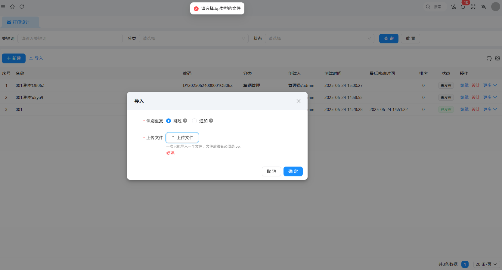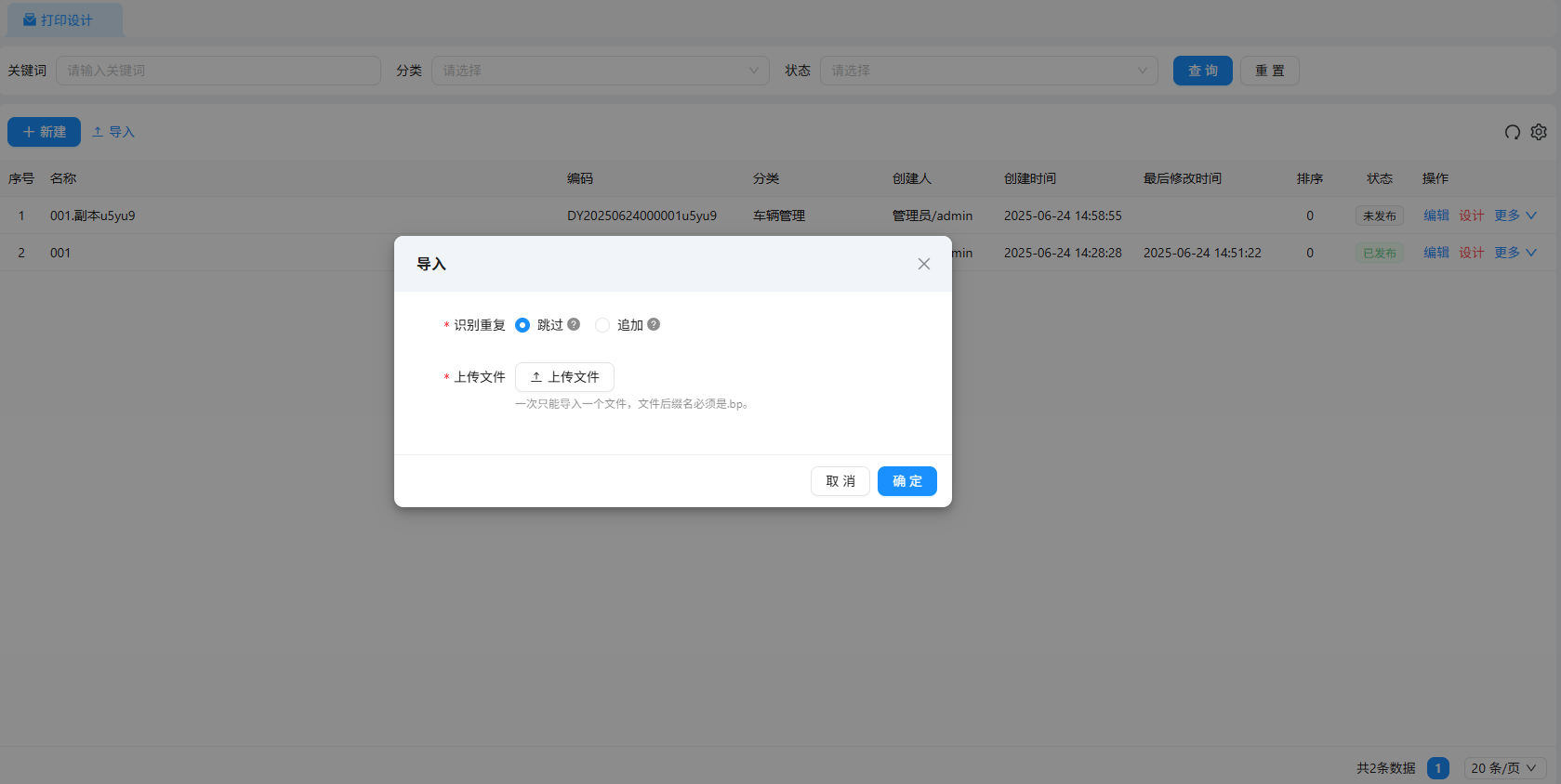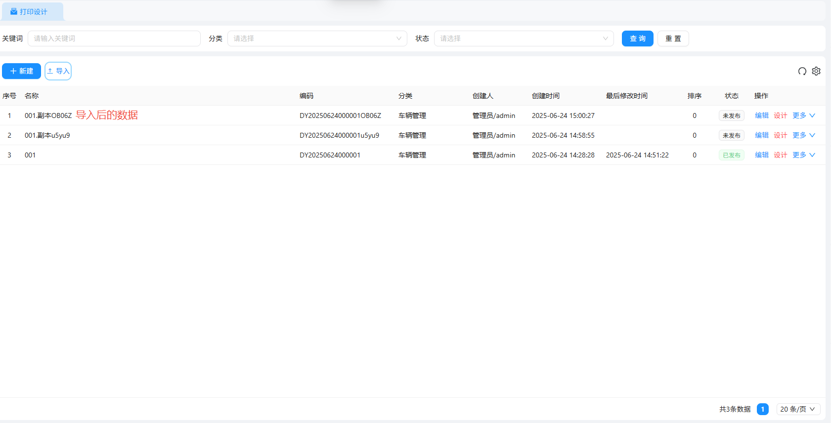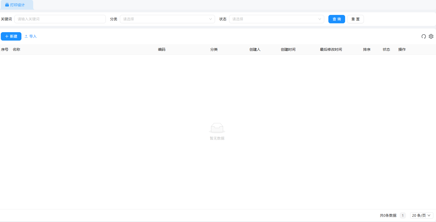 打印设计列表,支持查询(根据名称或编码关键词,及分类、状态查询)、新建、刷新、导入导出等功能