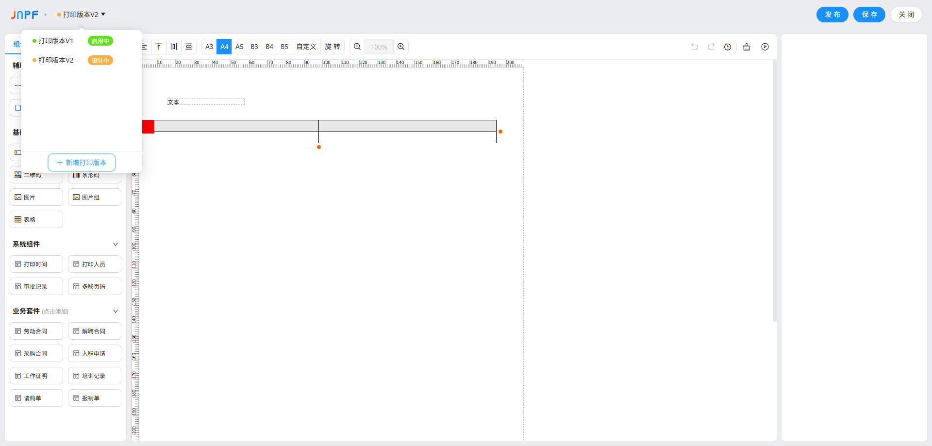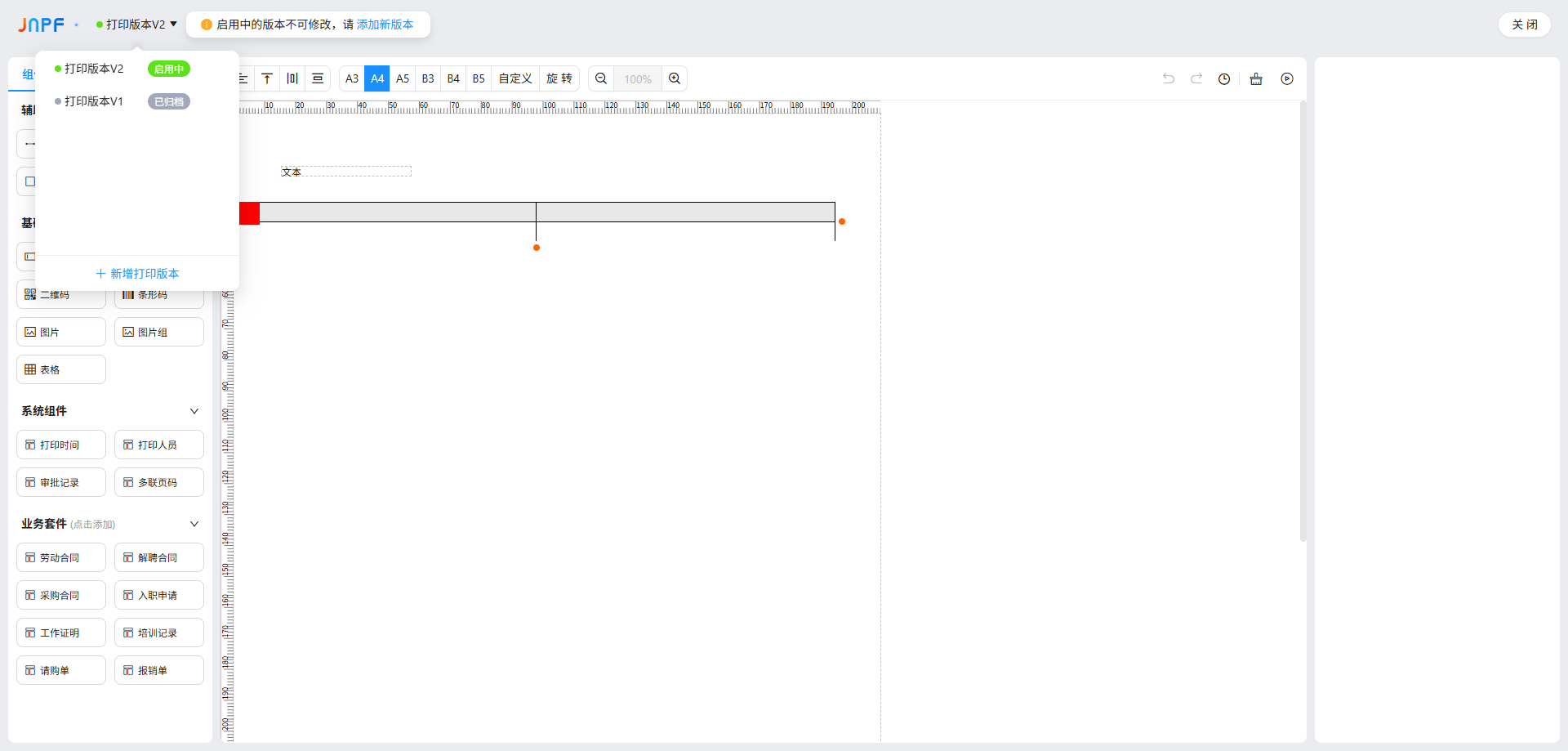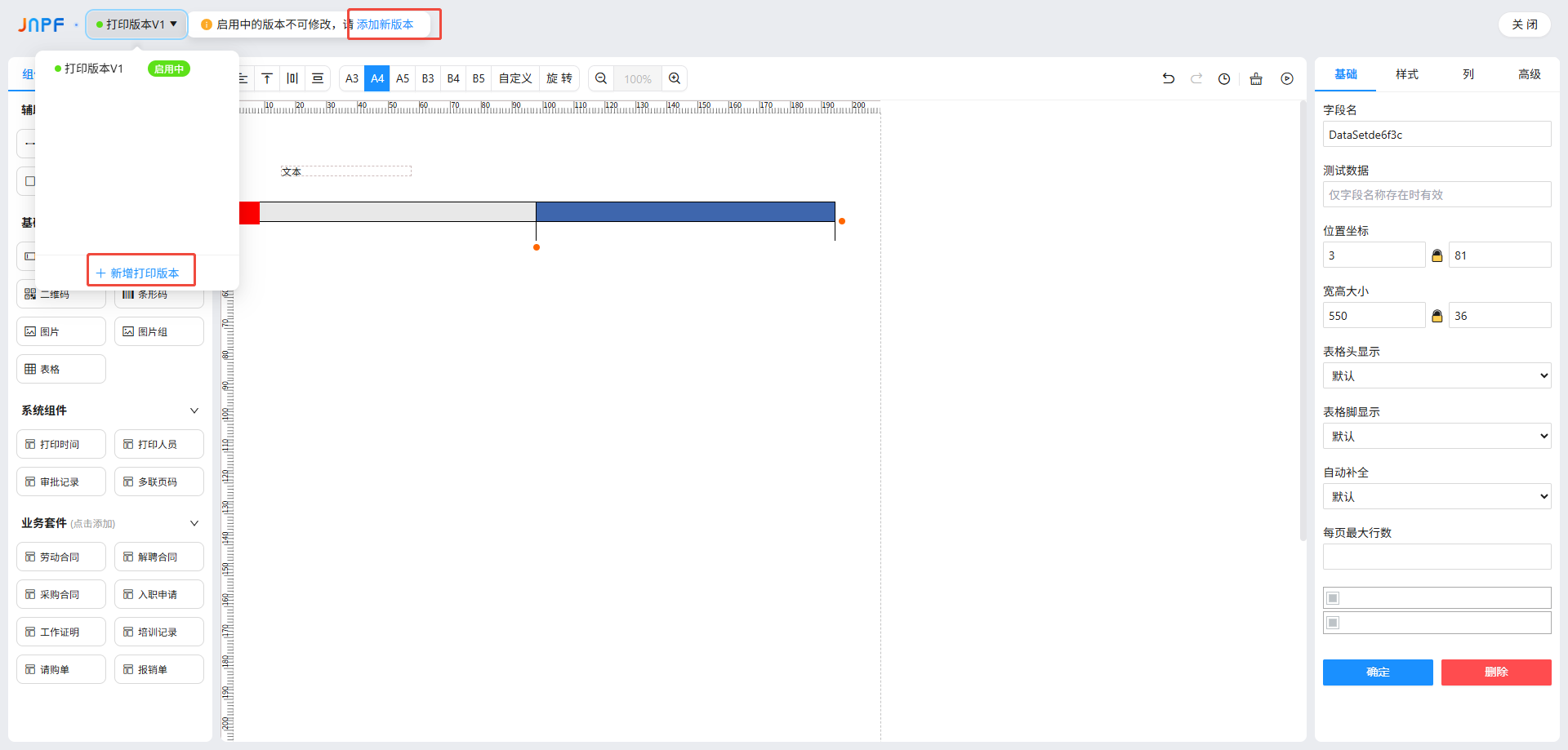 3、点击添加新版本或点击新增打印版本,均可以新增一个内容与版本 1 一致的打印模板