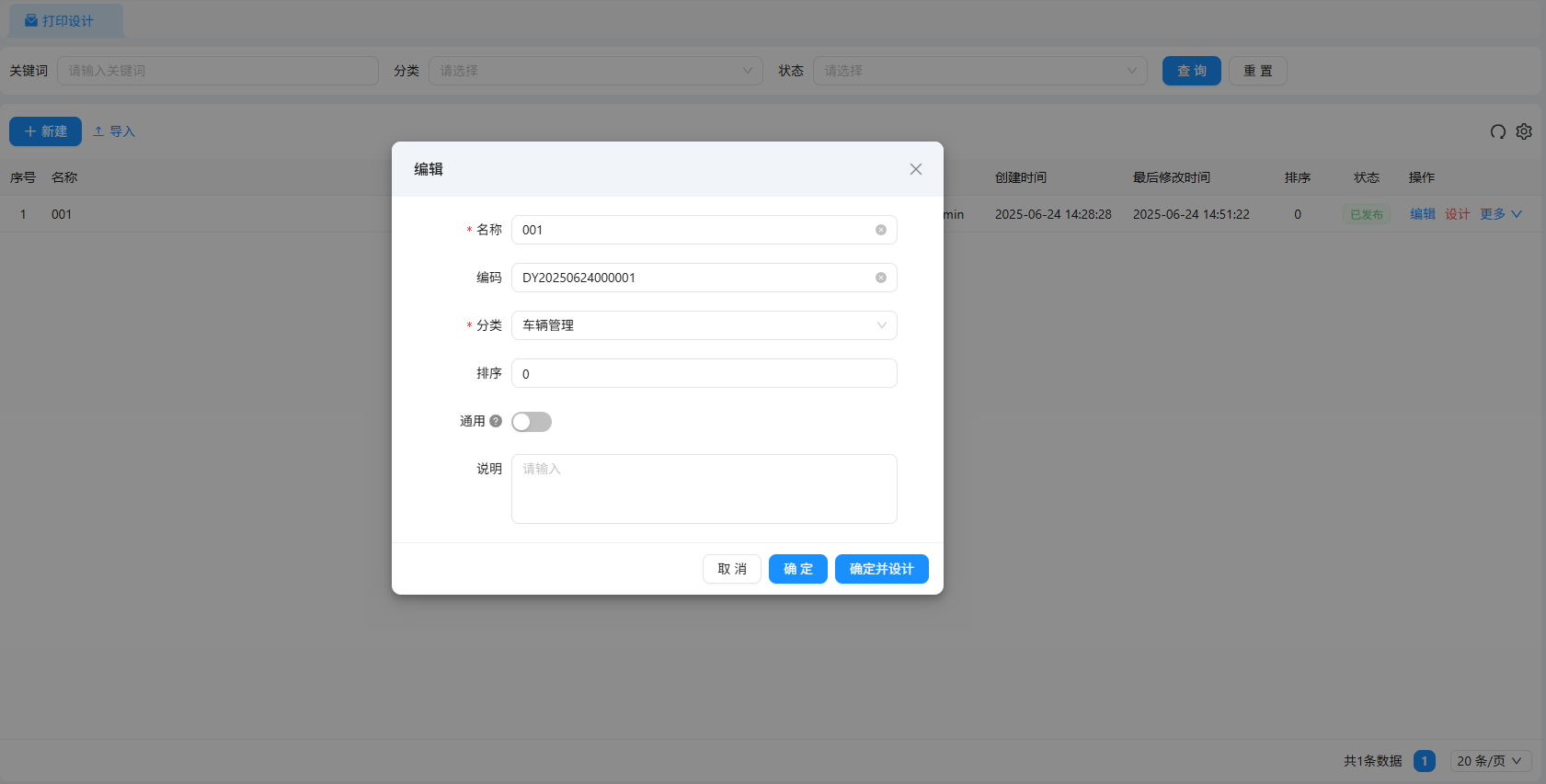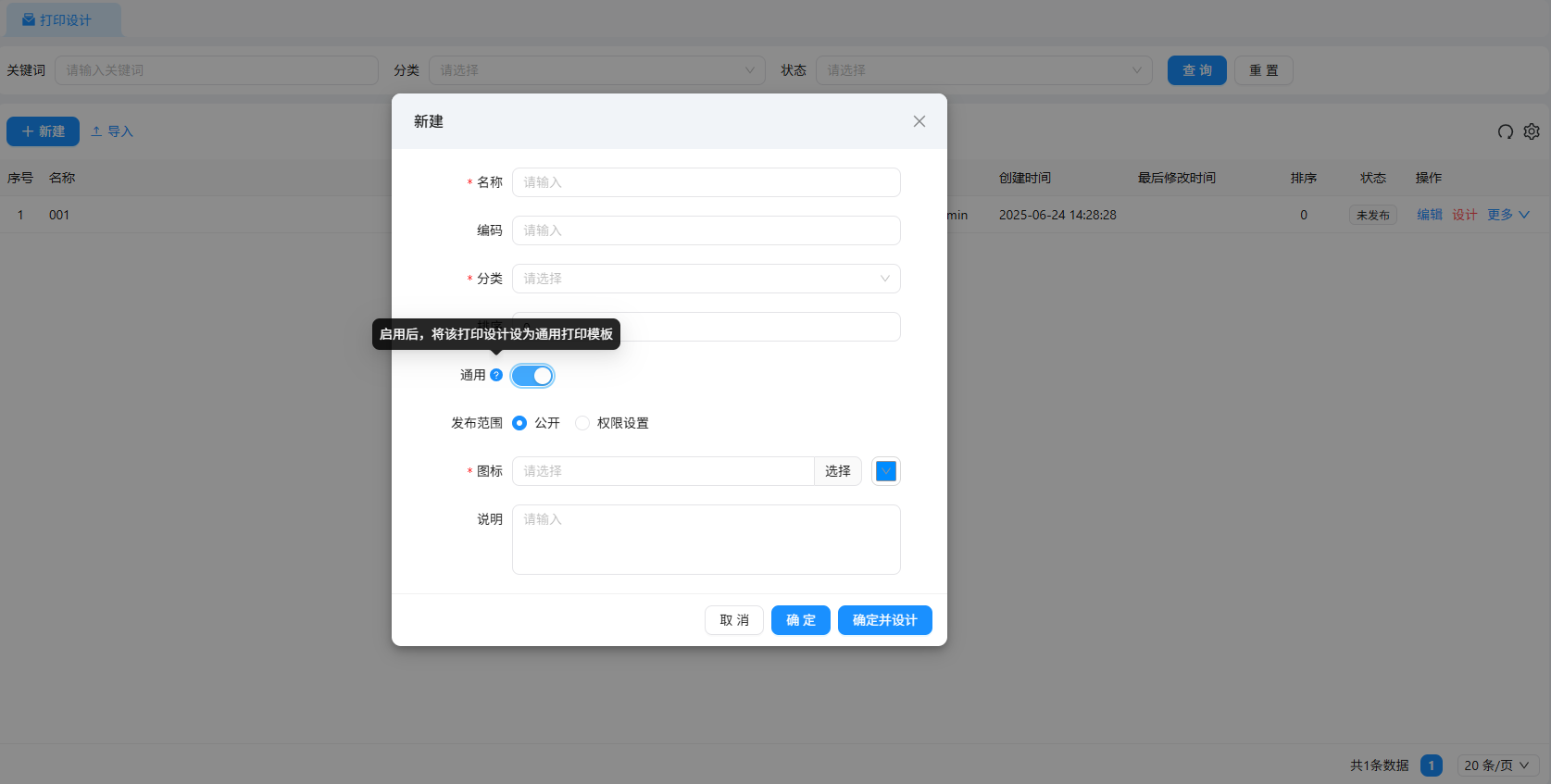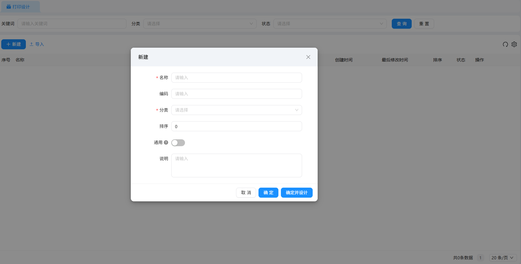 点击新建,展示基础信息填写框,名称、分类为必填。填写后,点击取消,取消新建;点击确定,基础信息保存,页面回到打印设计列表,点击确定并设计,进入打印模板设计页;编码不填写保存后,自动生成编码,编码规则为 DY+年月日+六位数序列号