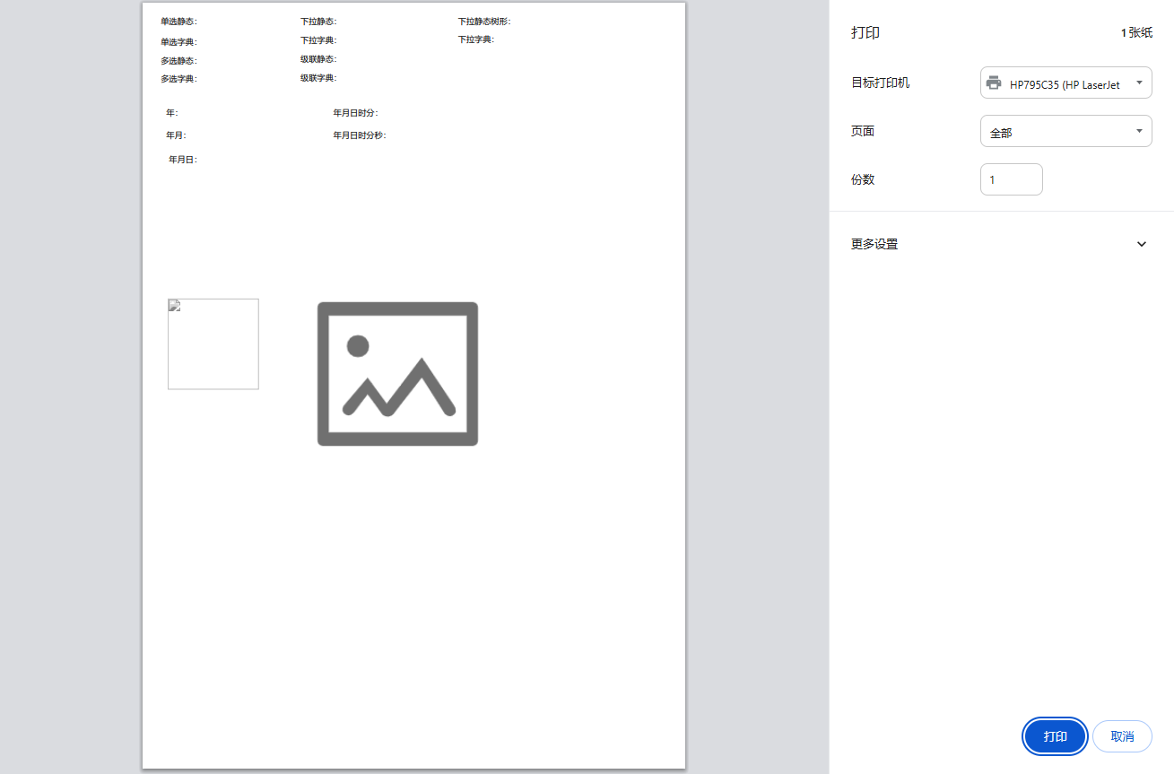 打印设计支持自定义打印的格式包括打印版本、组件、数据源等设置,与表单设计的列表和详情页面,或工作流程的列表和详情结合使用。