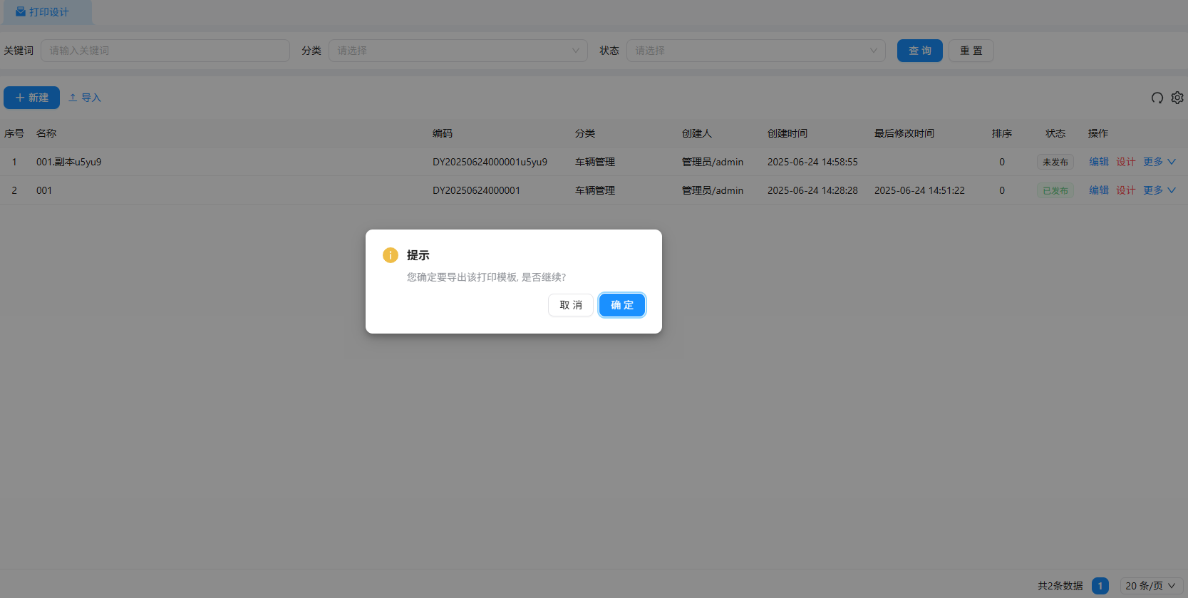在更多下操作导出功能,弹窗提示:您确定要导出该打印模板, 是否继续?,点击取消关闭弹窗;点击确定可导出打印模板到本地