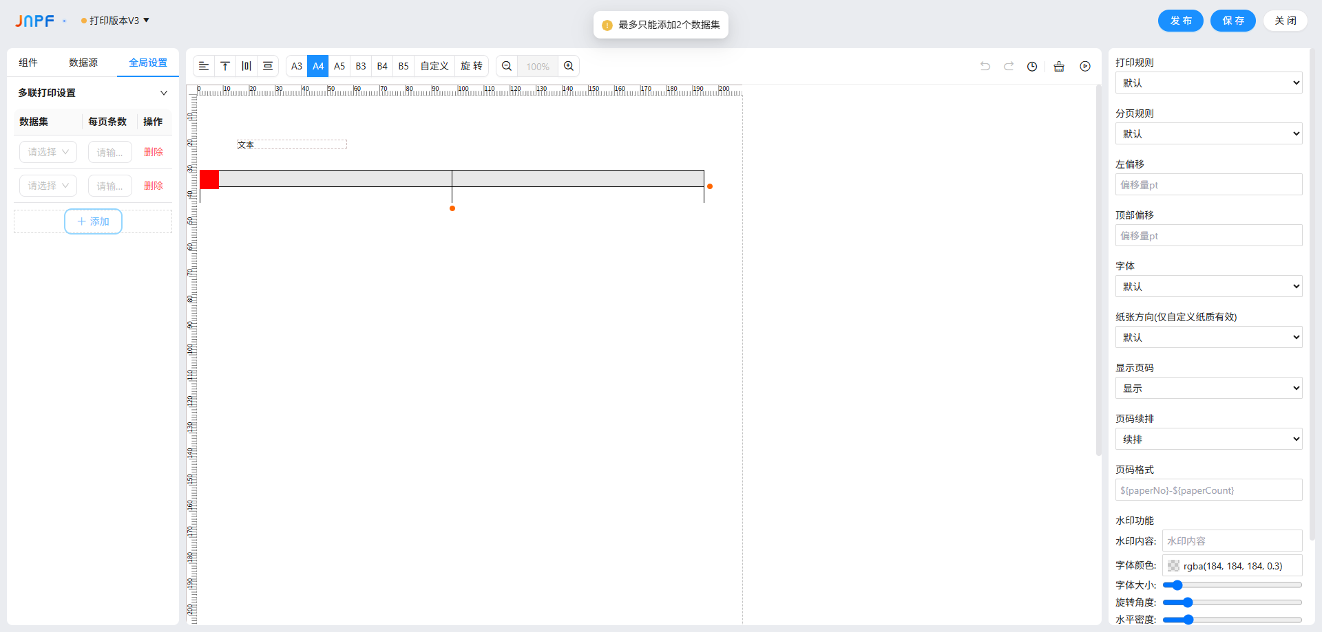 在全局设置中,可配置多联打印设置,最多添加两条数据,数据集下拉数据展示为数据源中设置的数据集
