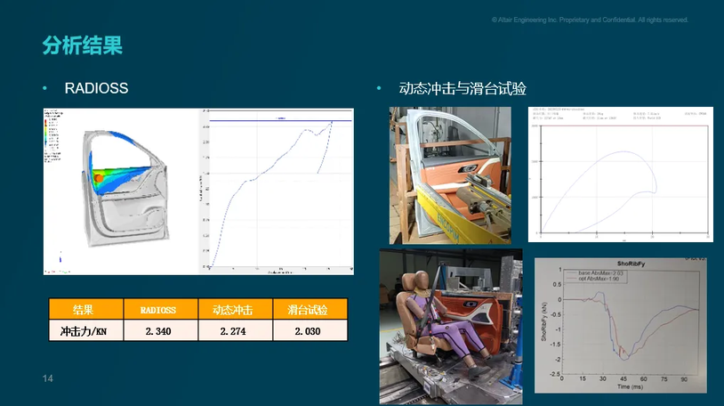除了静态结构性能,汽车车门总成的动态冲击测试也是验证舒适性和安全性的关键一环。我们利用 Radioss 搭建了车门总成冲击仿真场景,模拟实车不同假人不同位置对车门内饰总成碰撞,为整车侧碰和柱碰提供参考。通过与滑台试验和动冲工装试验的对标,我们验证了仿真模型在动态响应方面的准确性,确保冲击力预测与实测误差在合理范围内。