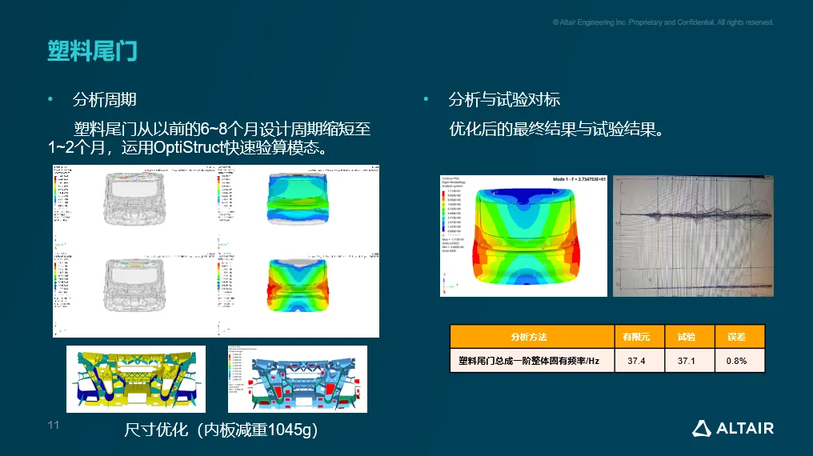在我们的塑料尾门项目中,最大的挑战是如何在大幅减重的同时,满足结构刚度与模态目标。借助 OptiStruct,我们构建了完整的实车仿真模型,进行了结构优化和尺寸优化。通过反复验证和局部加强设计,尾门模态从初始的 20Hz 提升到 27Hz 以上,顺利达到项目目标。同时,我们还成功减重 1045g,减重后的结构在实车模态实验中的误差仅为 0.3Hz,仿真精度令人非常满意。