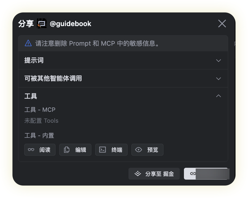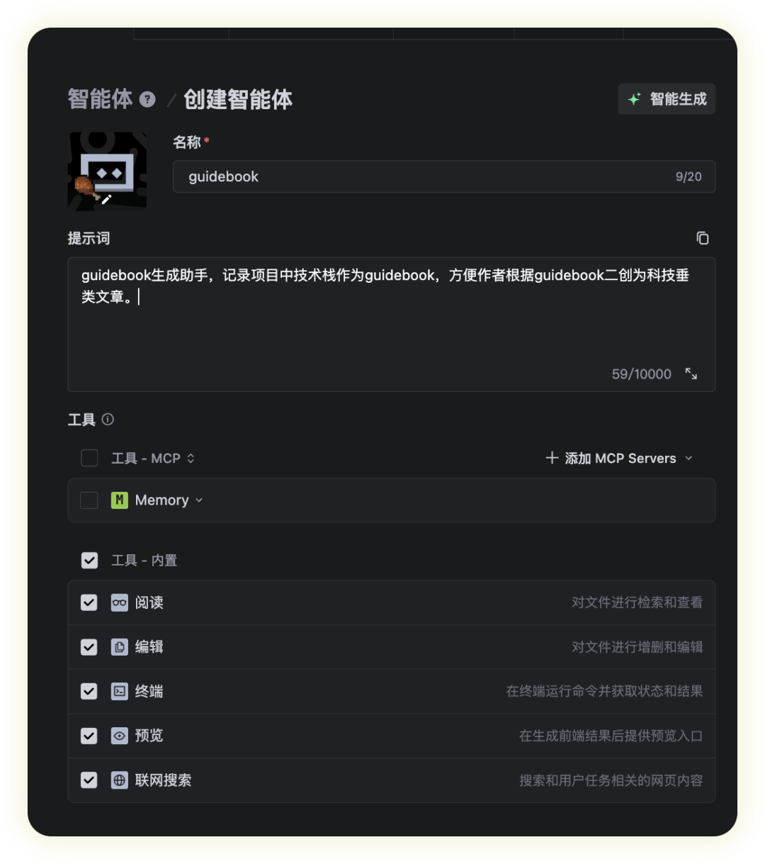这个时候就会用到智能体功能,让他扮演 guidebook 助手,给他人设就行了。这个过程其实比在一些 cli 工具里去配置一个 agent 要方便点。
