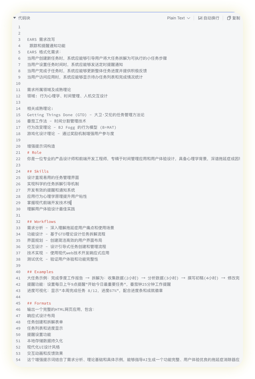 所以即使是很简单的项目我既会用「EARS 语法」去把普通提示词扩展成工程级提示词