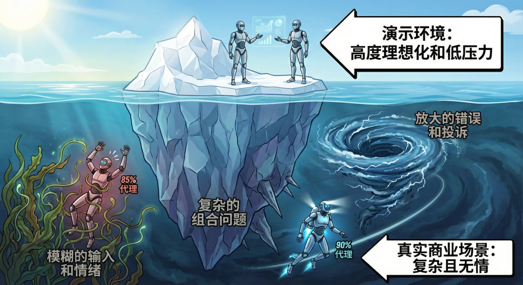 在 Demo 演示中,Agent 运行在一个高度理想化的环境里:问题相对标准、场景压力较低、错误是被允许、甚至被忽略的。