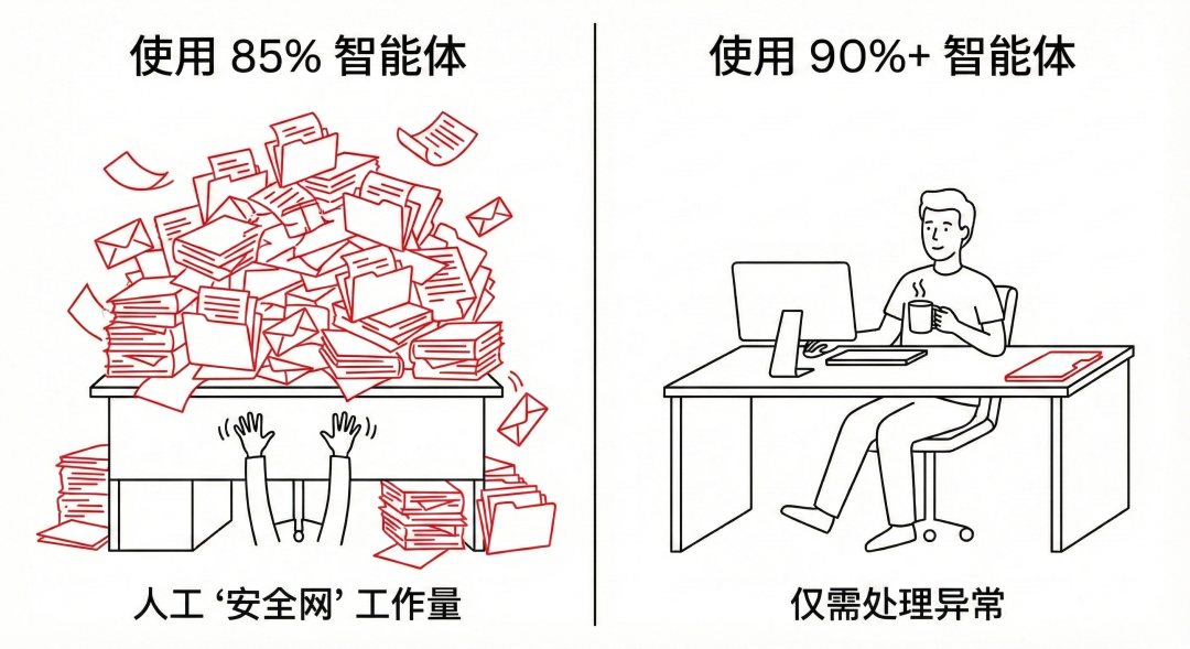 而 90%以上的 Agent 错误开始变成小概率事件,人工从“兜底者”转为“例外处理者,才具备形成稳定业务闭环的可能。