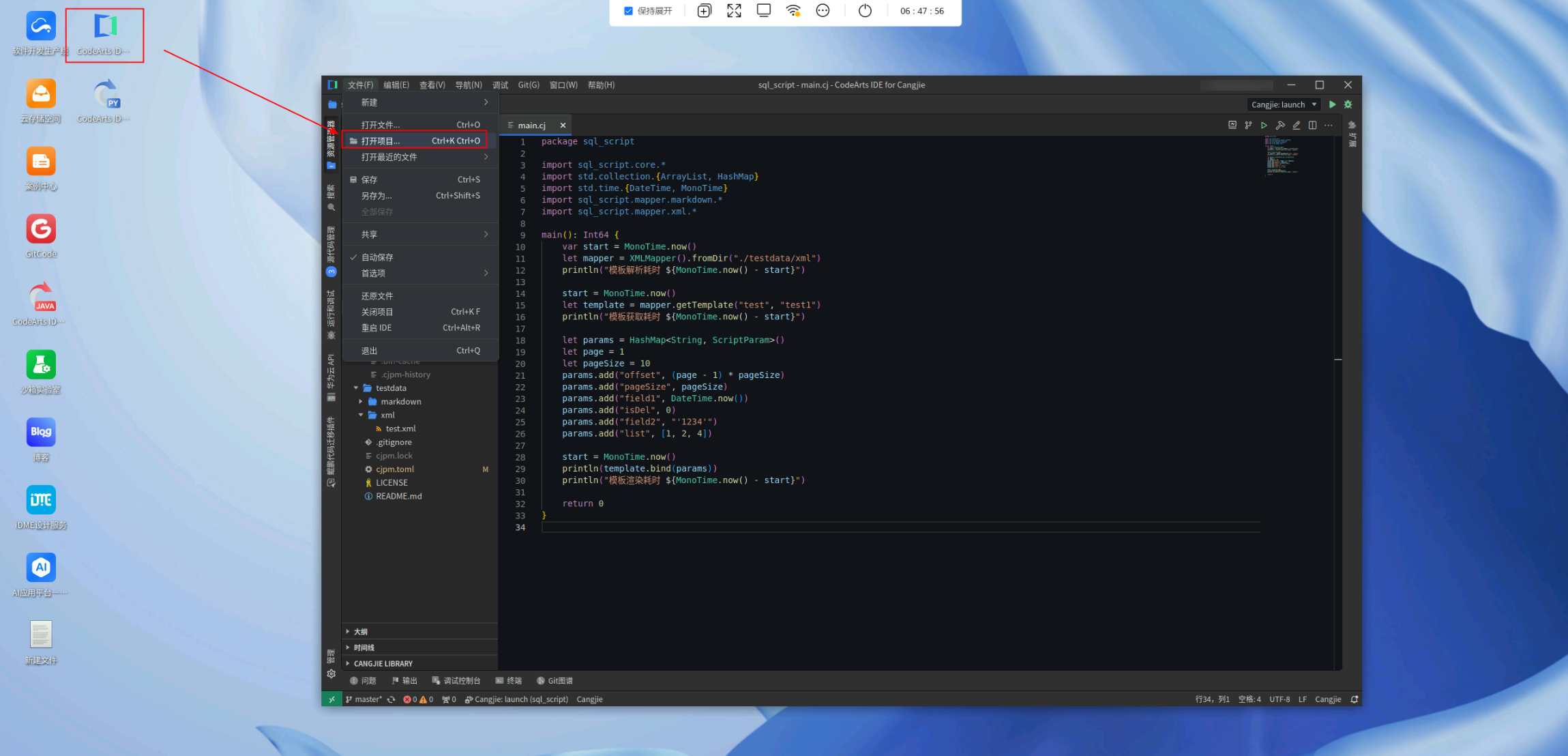 打开项目后,在仓颉编辑器左侧项目工程目录中找到src/main.cj文件,将以下代码替换原代码。