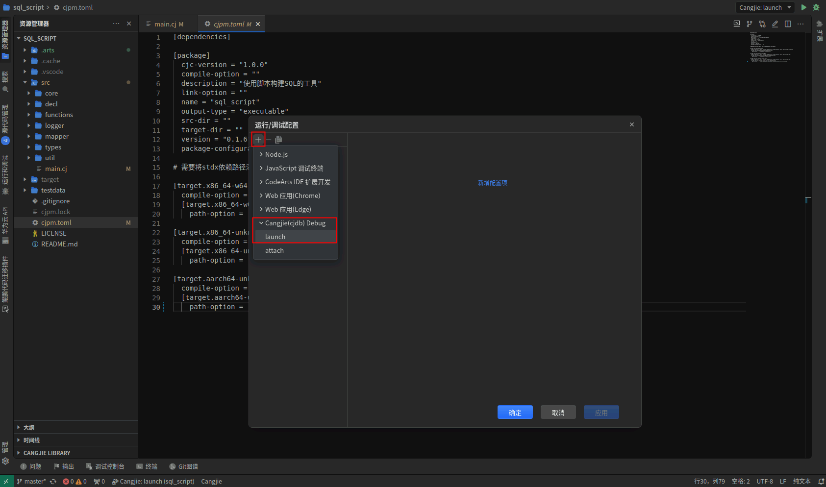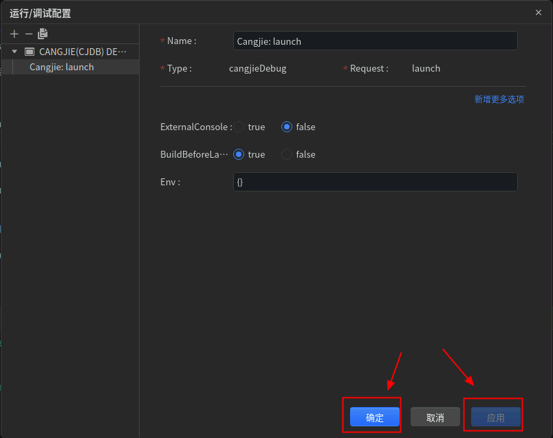 在运行/调试配置页面,左上角点“**+”,下拉选项中选择 Cangjie(cjdb) Debug > launch**。