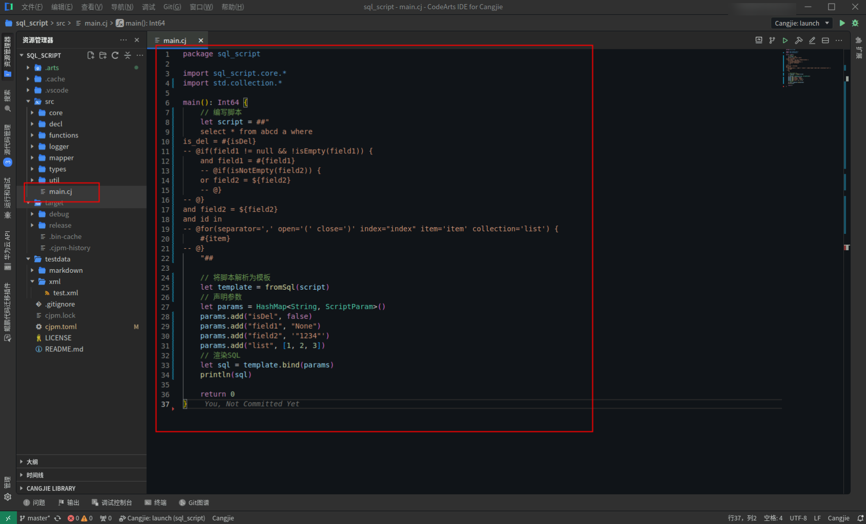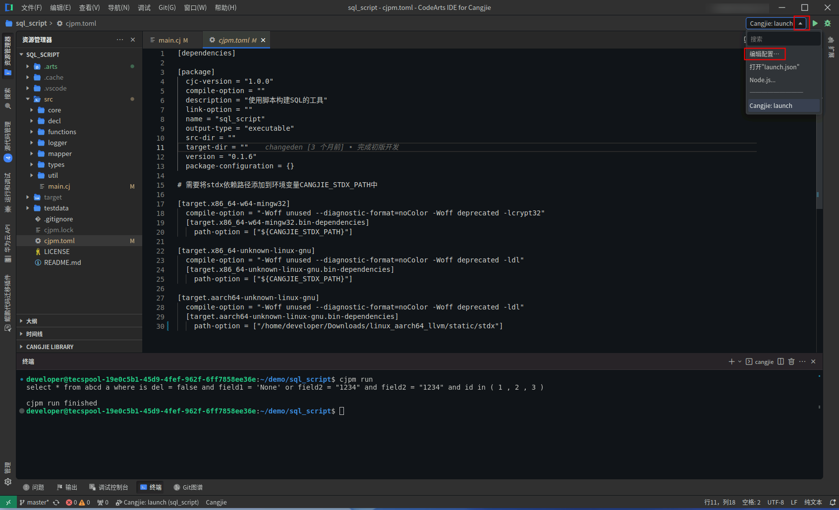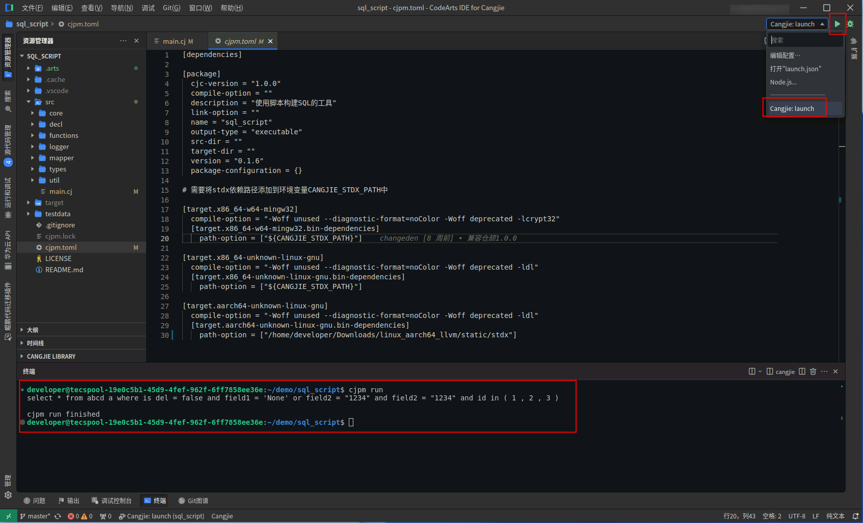 本案例基于华为开发者空间云主机的 CodeArts IDE for Cangjie 编辑器进行操作演示。我们拉取 sql_script 源代码,修改 main.cj 内容,测试该工具的能力。