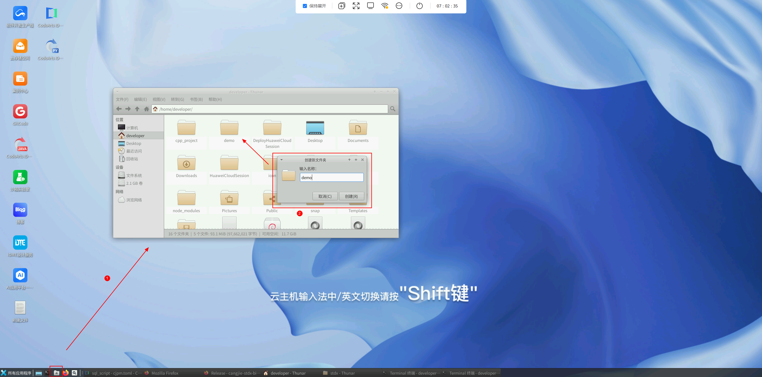 在云主机桌面点击左下角 File Manager,在/home/developer/目录下,空白处右键,选择创建文件夹,并将文件夹命名为demo。