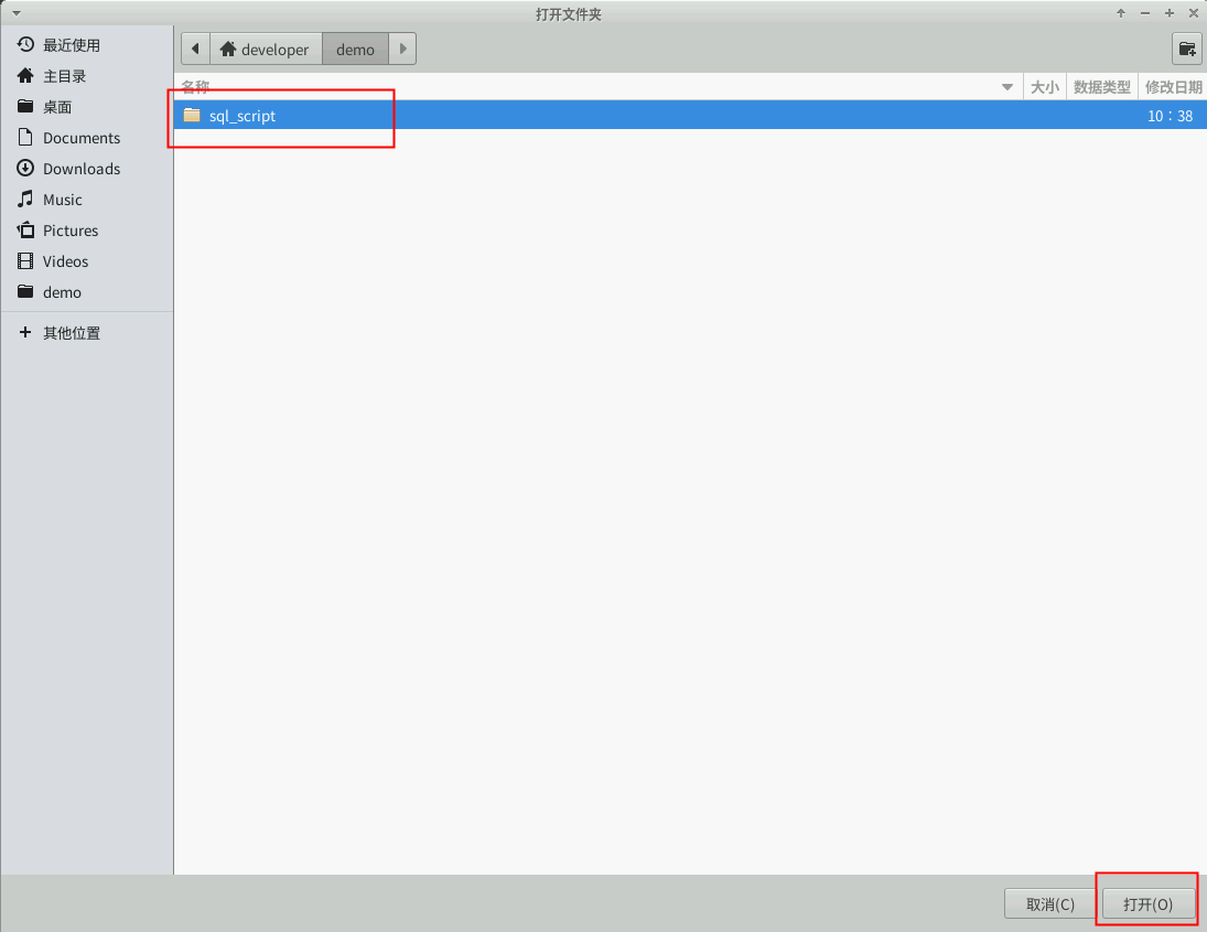 找到上一步中代码下载到本地的路径,本案例中为:/home/developer/demo/sql_script,点右下角打开。
