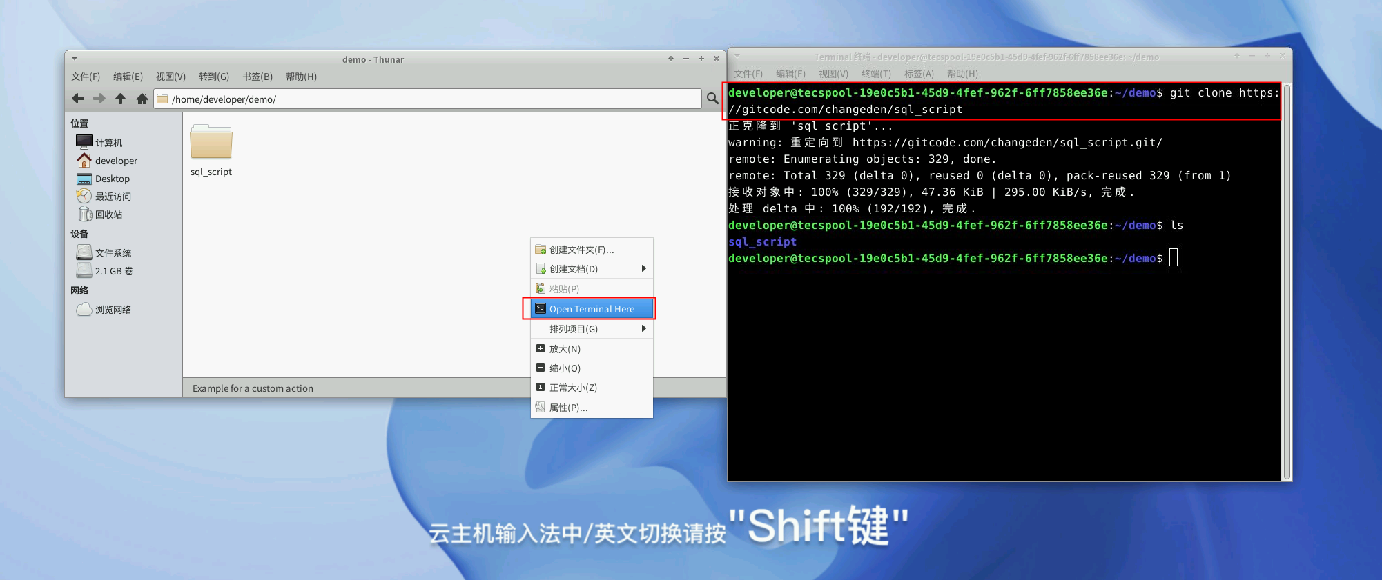 进入/home/developer/demo目录下,右键 Open Terminal Here,打开命令行窗口输入如下指令,下载项目源码到本地: